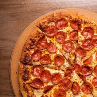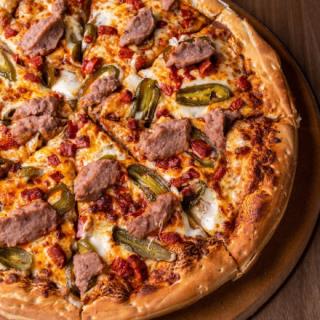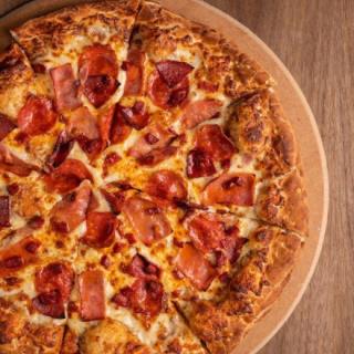 Nuestra receta única, salsa de tomate que se absorbe en masa fresca cubierta con mezcla de queso. Jamón, salami, pepperoni, chorizo y tocino