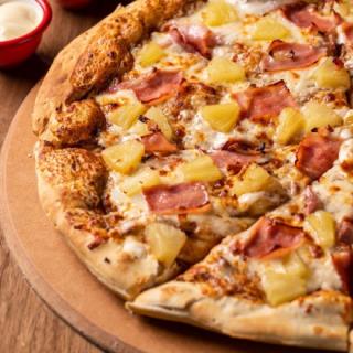 Nuestra receta única, salsa de tomate preparada y condimentada que se absorbe en masa fresca cubierta con mezcla de queso. Jamón, piña y tocino