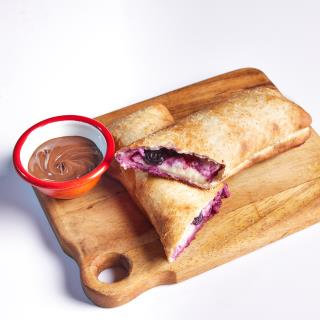 Relleno de queso crema dulce y frutos rojos, acompañado de salsa de avellanas.