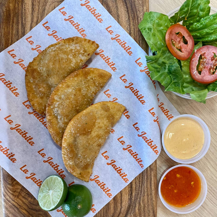 3 Empanadas de guiso gober acompañadas de lechuga y tomate.