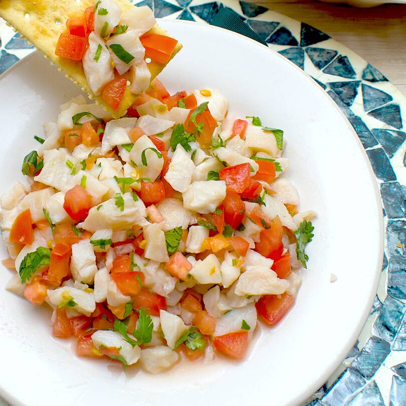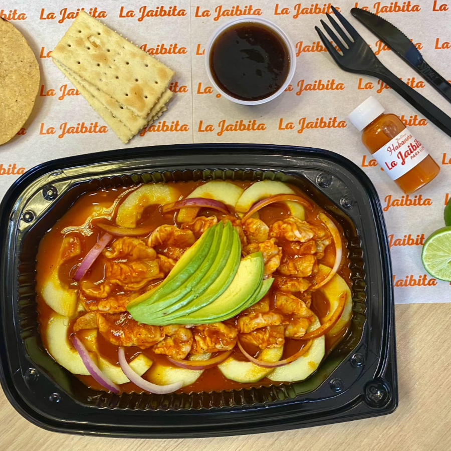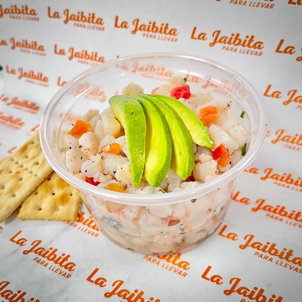 Medio litro de fresco ceviche de pescado con aguacate, acompañado de galletas y salsa picante.