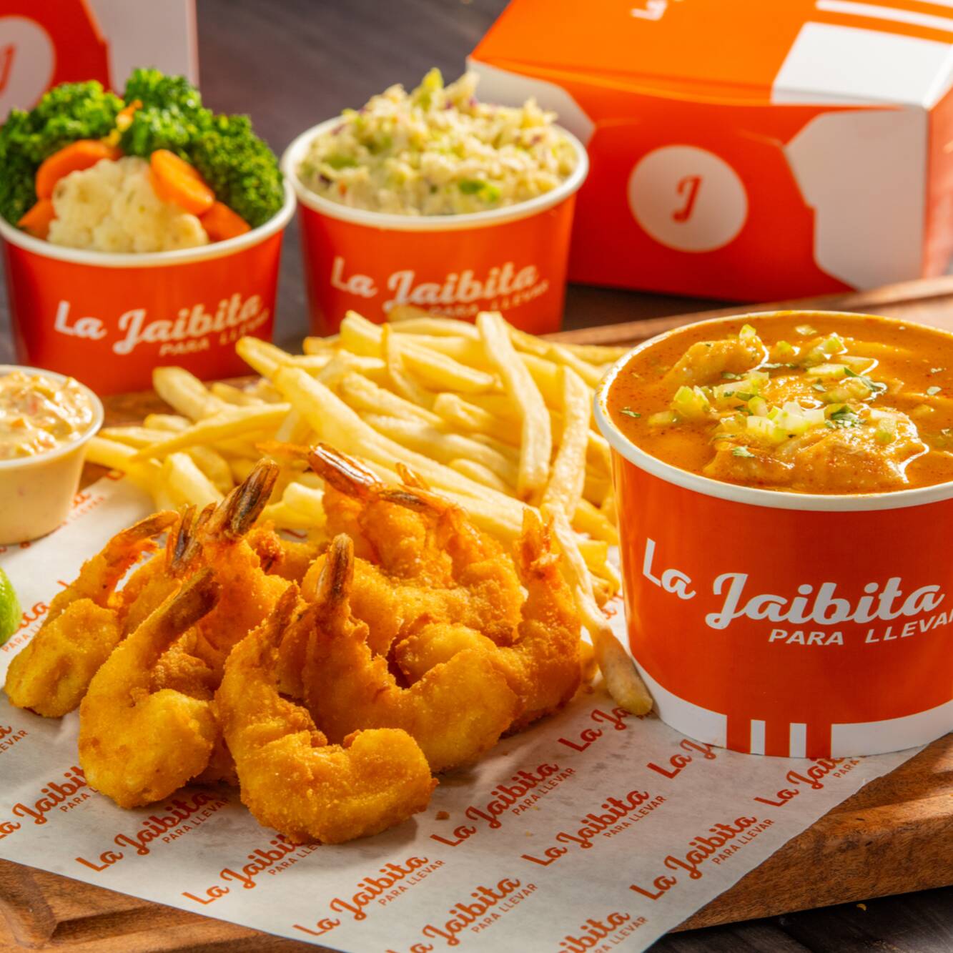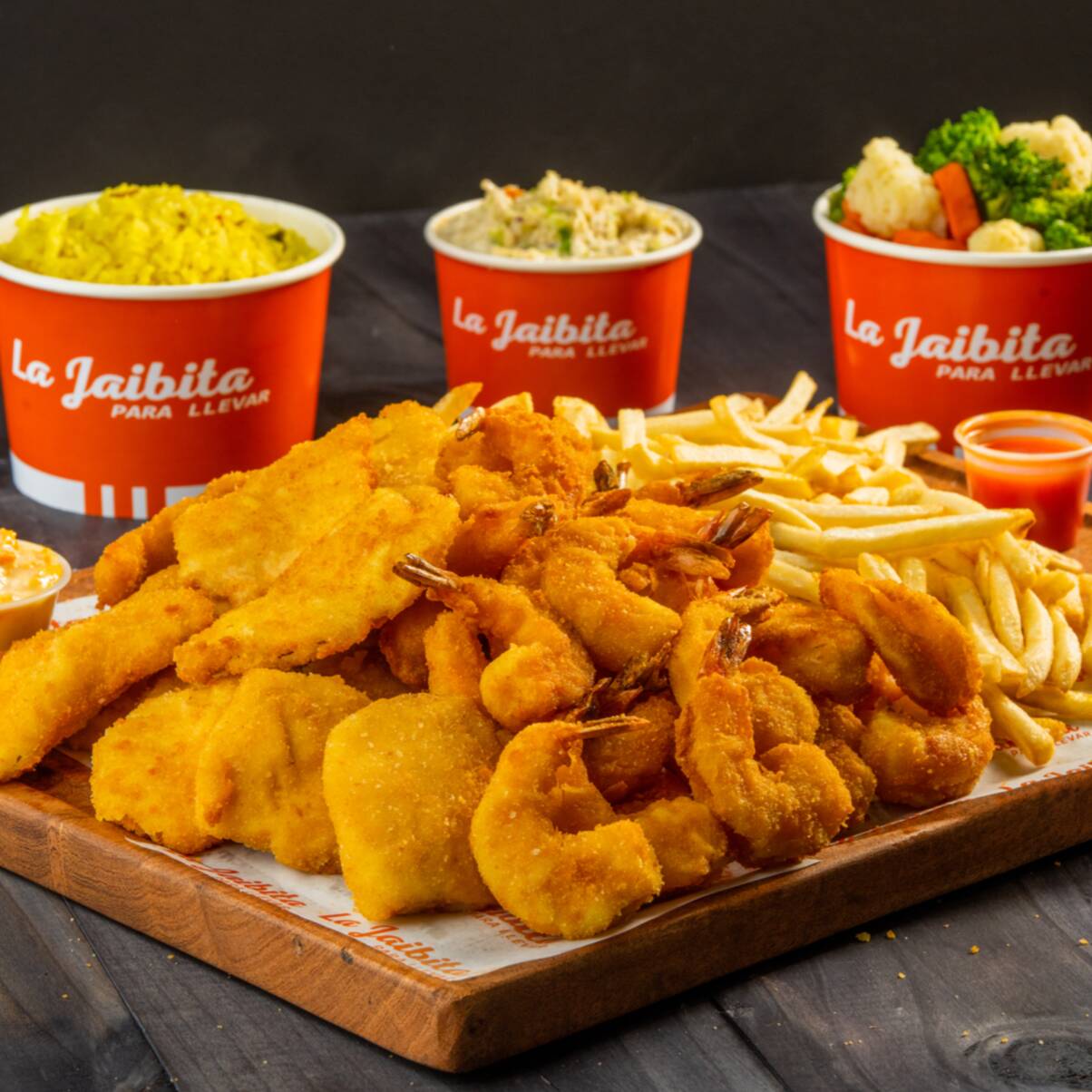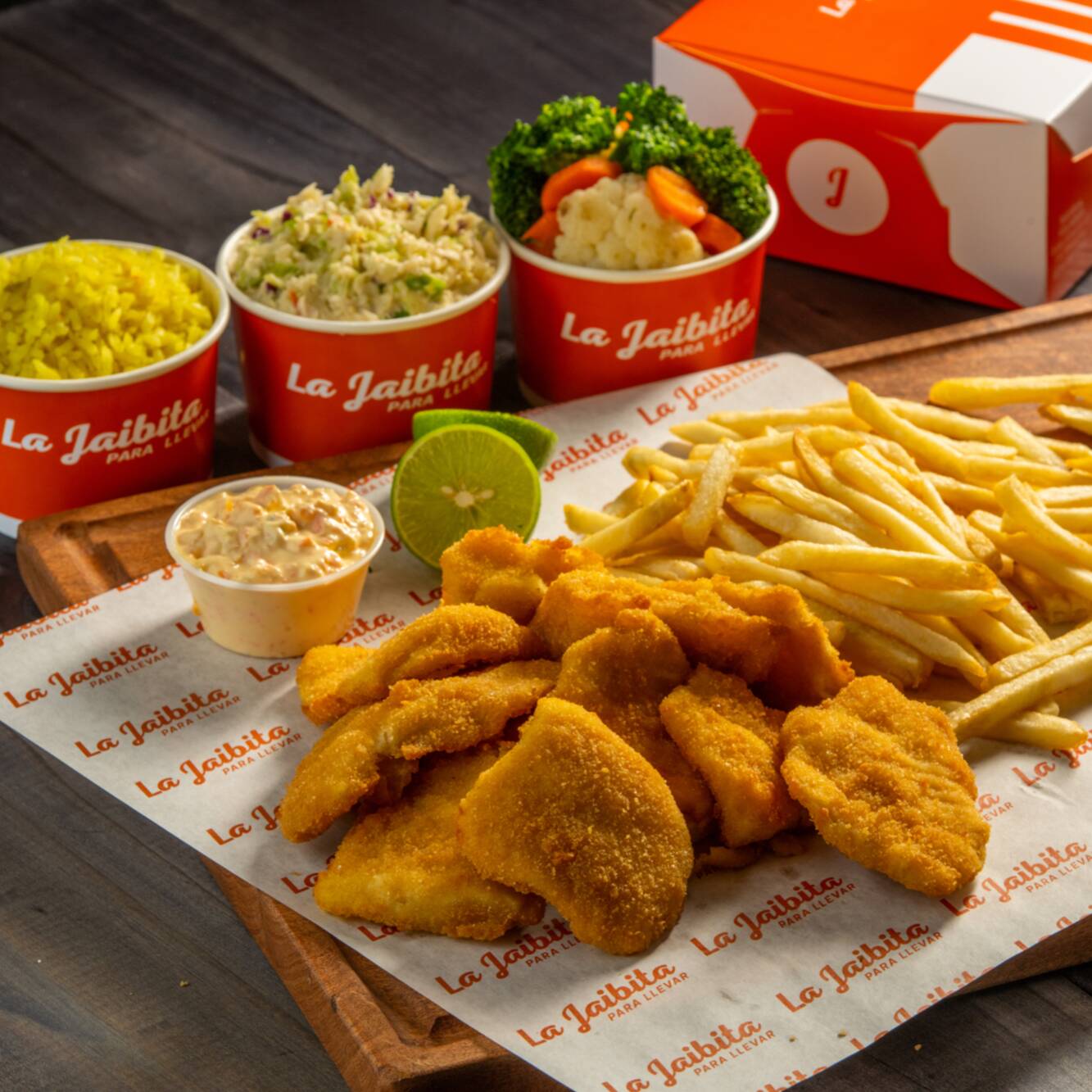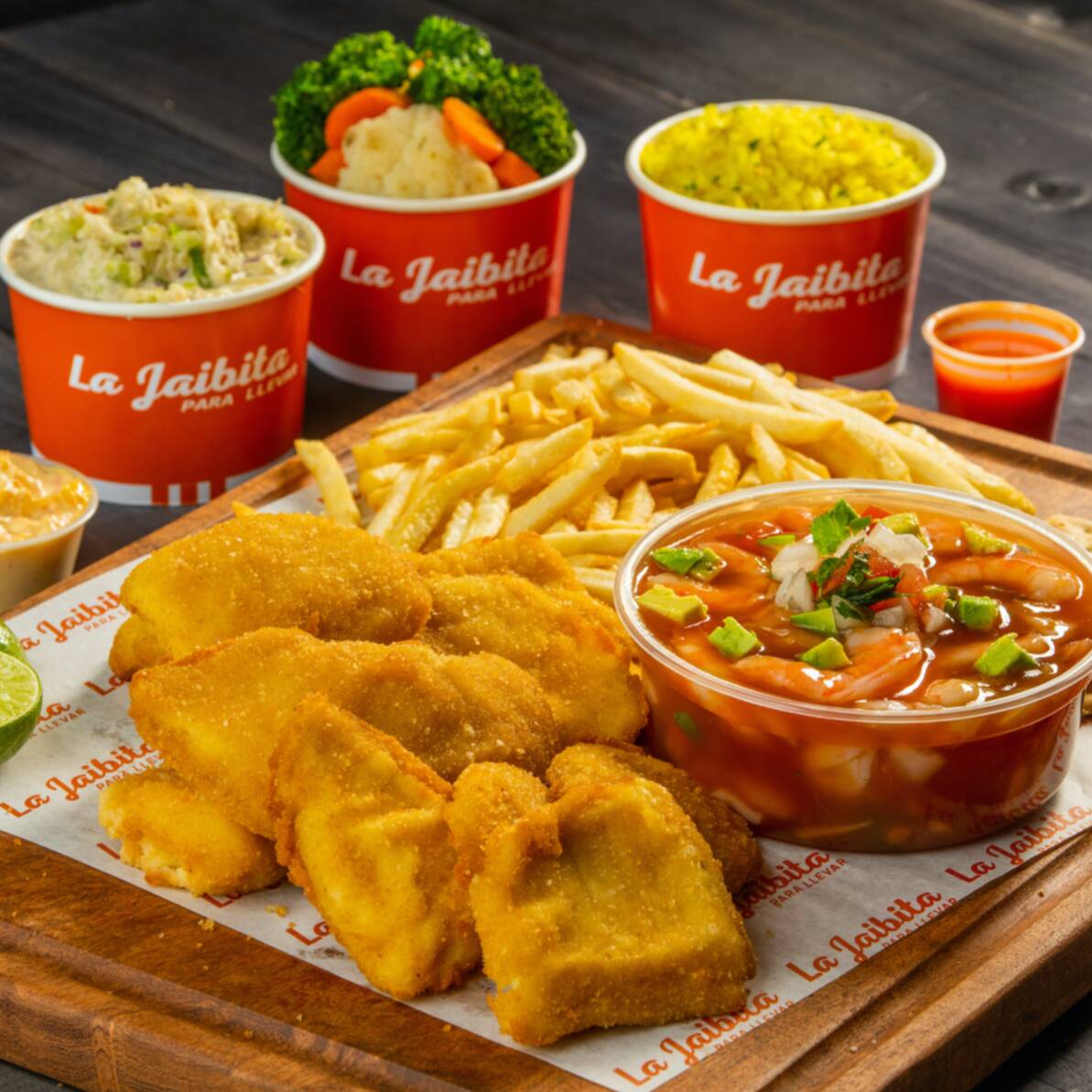 Medio kilo de filete de pescado y camarón empanizado, papas fritas grandes, arroz, verduras mixtas y ensalada de col. Incluye limón, galletas, aderezo tártara y chipotle