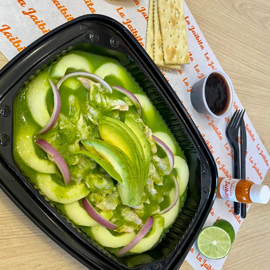 Camarones curtidos en jugo de limón, salsa verde, aguacate, pepino y cebolla.