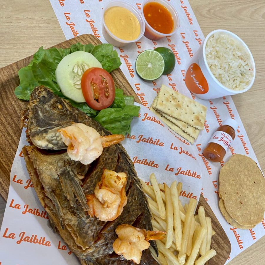 Mojarra entera frita, incluye 3 camarones acompañada de papas, lechuga, tomate, pepino y arroz.