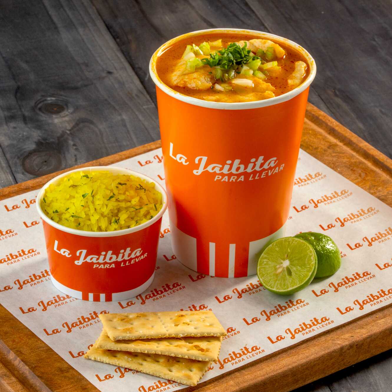1 Litro de caldo de pescado y guarnición de arroz. Incluye 2 panes, galletas, limón y salsa picante.