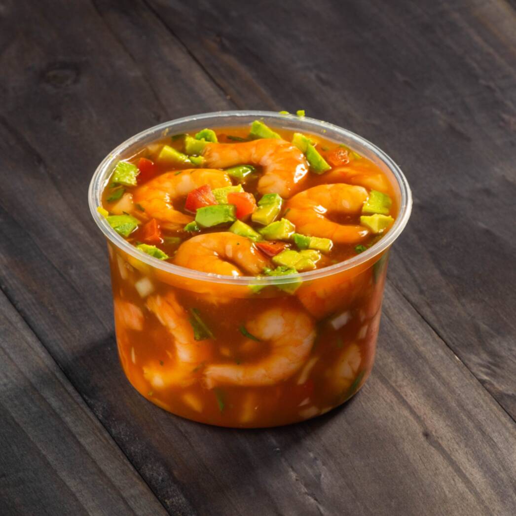 Camarones curtidos en jugo de limón, salsa roja, aguacate, pepino y cebolla.