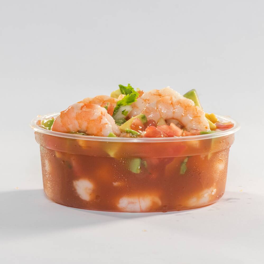 Medio litro de coctel de camarón con aguacate y pico de gallo, acompañado de galletas y salsa picante.