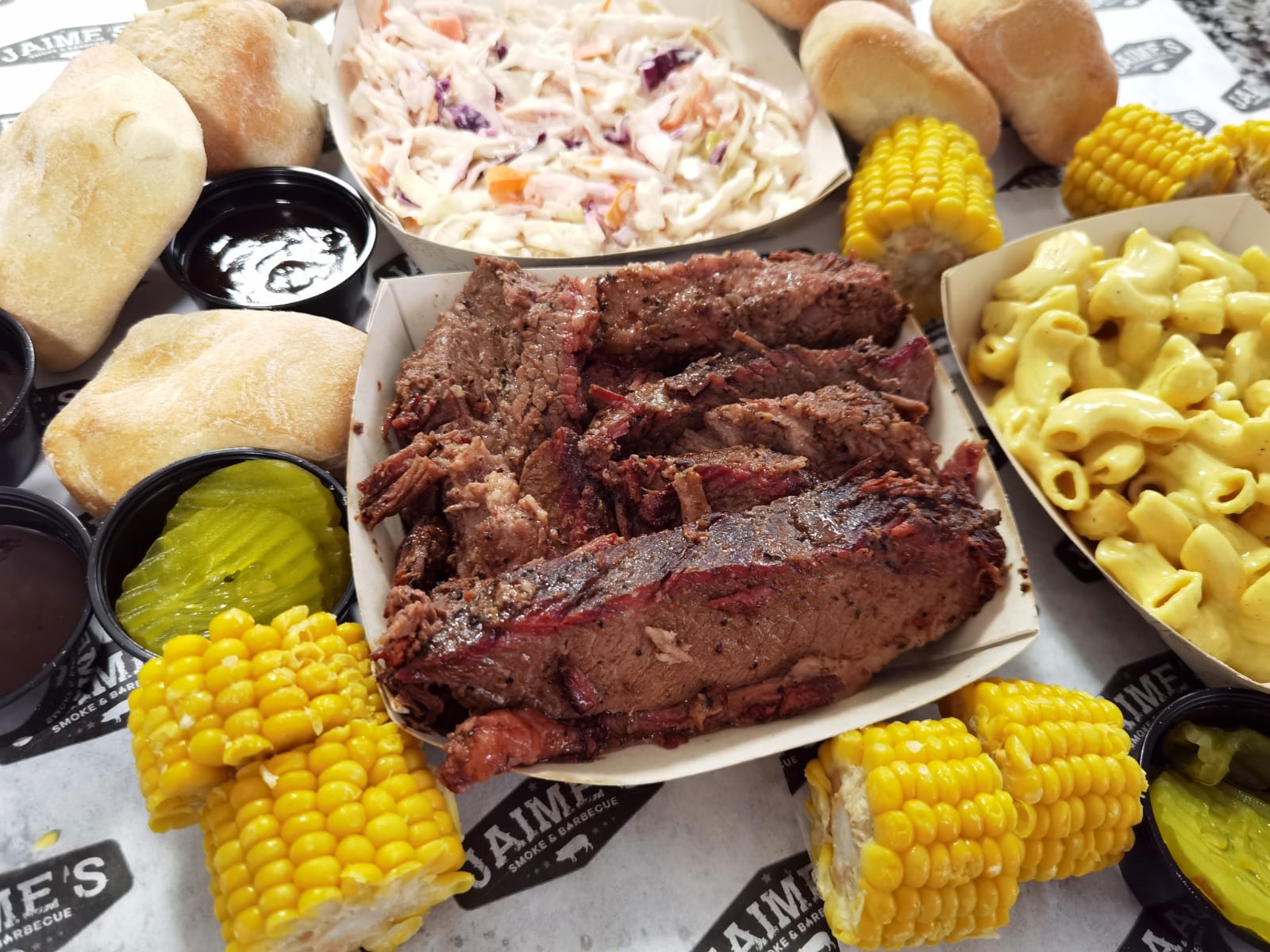 Brisket 1 kg, 4 complementos más panes, BBQ y pepinillos todo ahumado por 12 horas con madera de manzano y nogal.