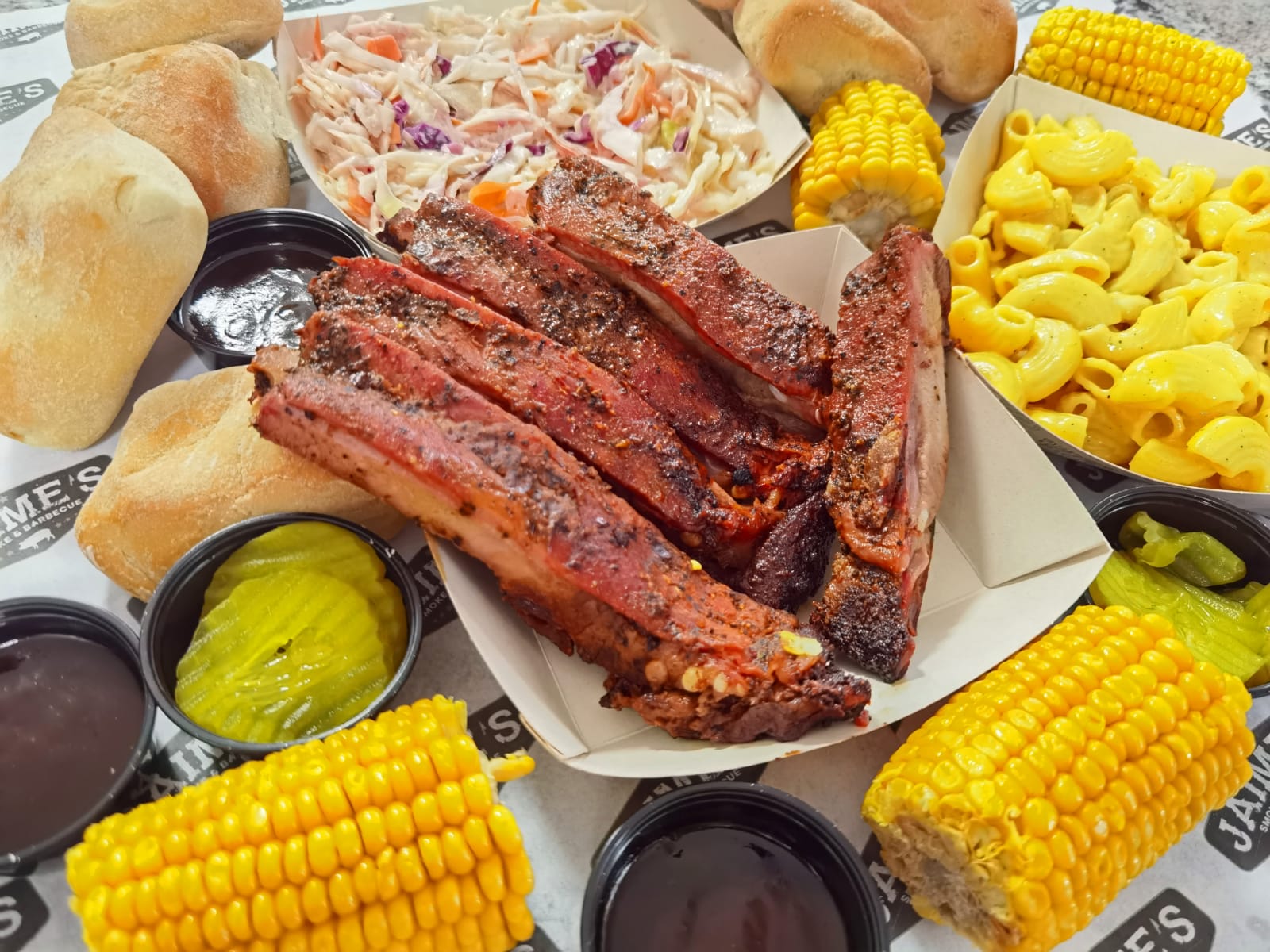1/2 kg De costilla st Louis, 2 complementos más panes, BBQ y pepinillos, todo ahumado por 12 horas con madera de manzano y nogal.