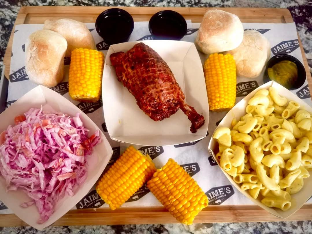 500 g (aprox) de chamorro ahumado, 1 complemento individual más panes, BBQ y pepinillos todo ahumado por 12 horas con madera de manzano y nogal.