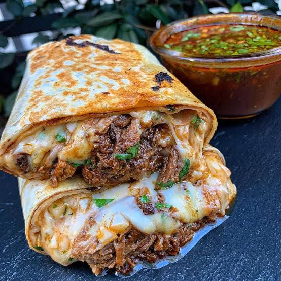 Tortila de burrito de harina, frijolitos queso y birria de res tatemada estilo jalisco acompañado de cebolla asada y salsa