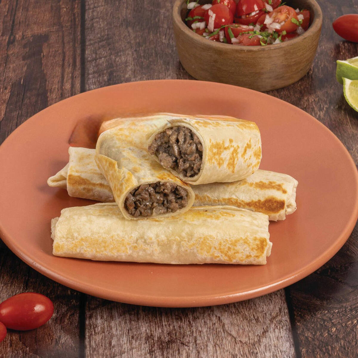 Tortilla de burrito de harina con frijoles queso y carne asada. acompañada de cebolla asada y salsa