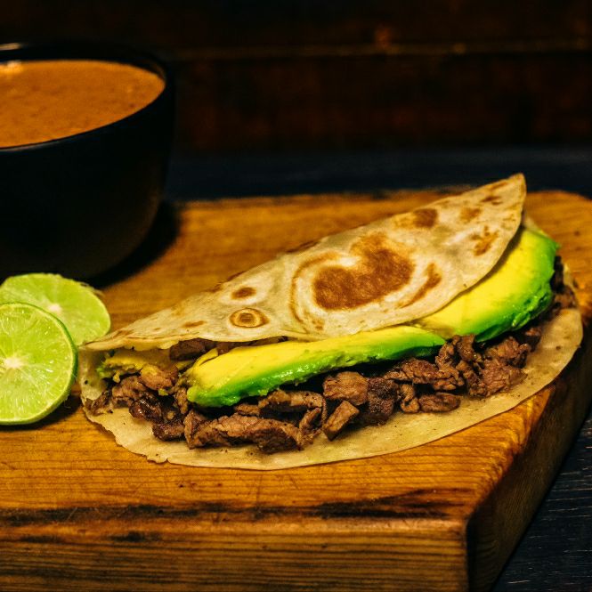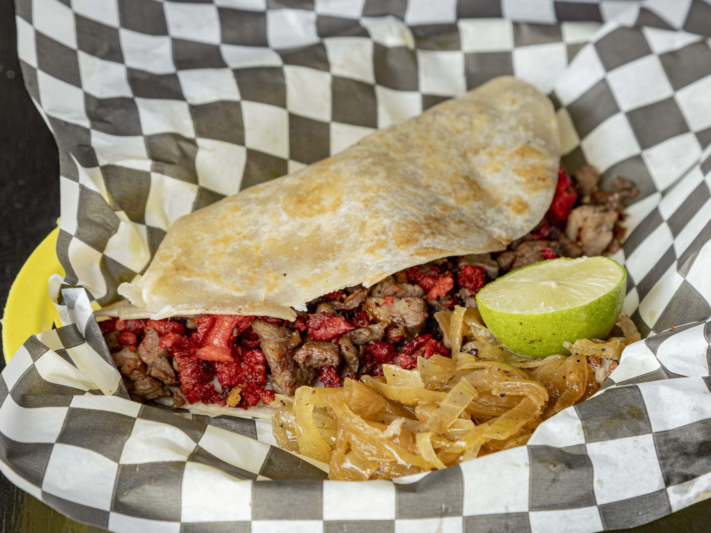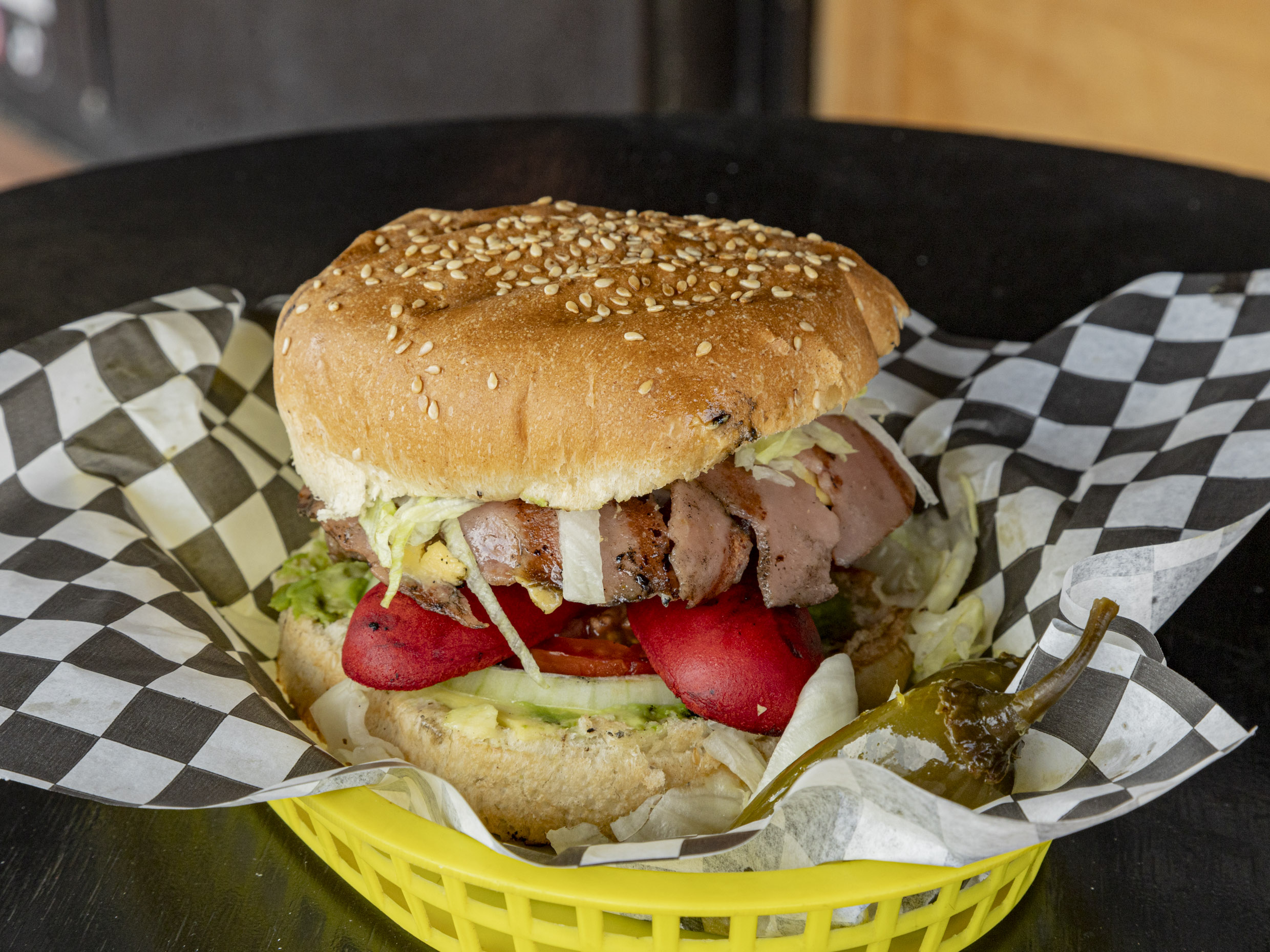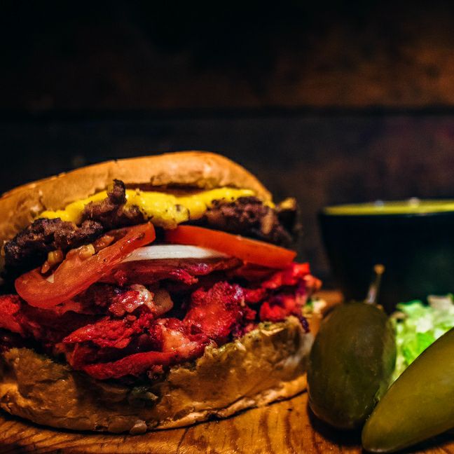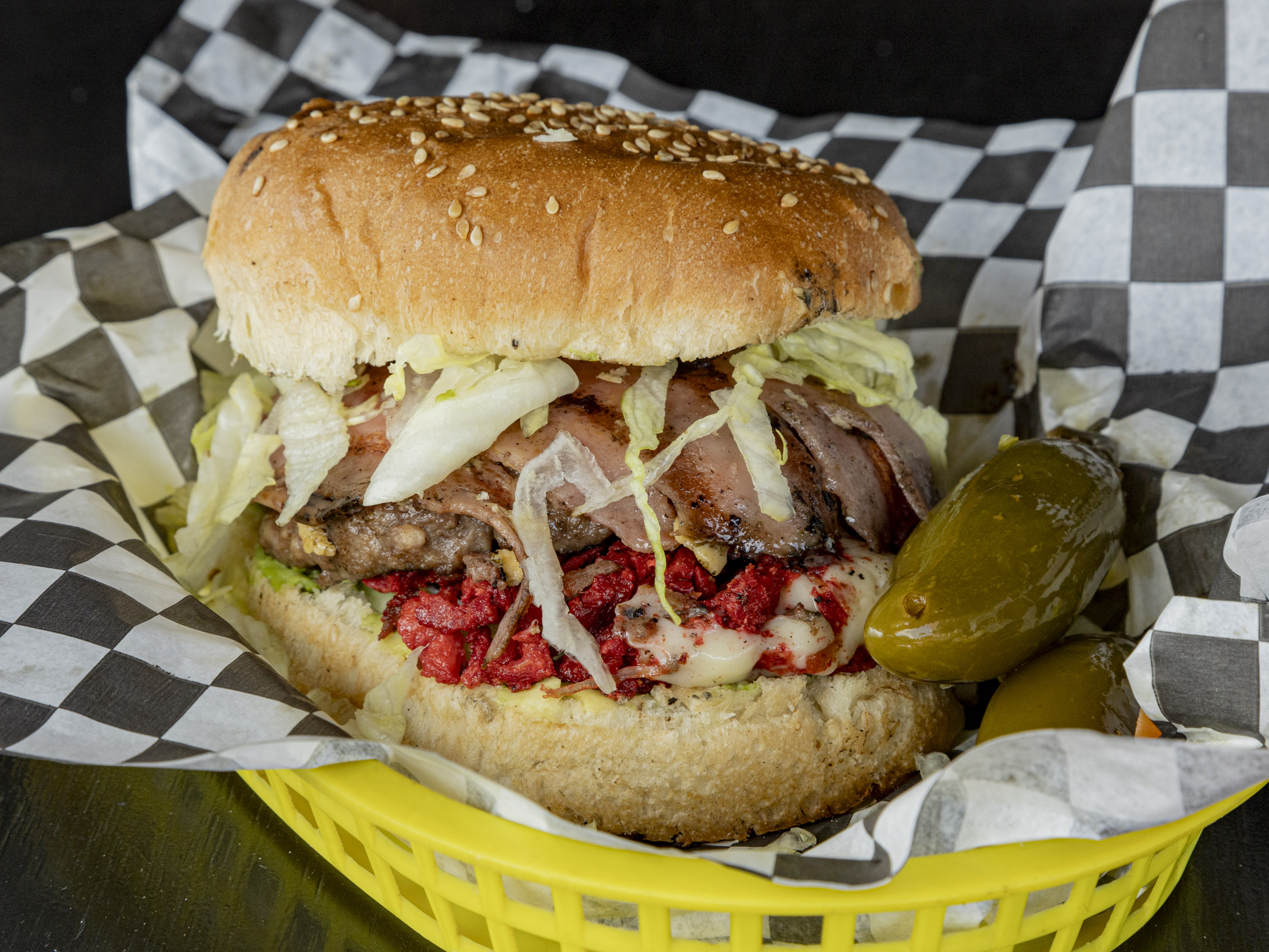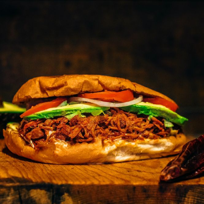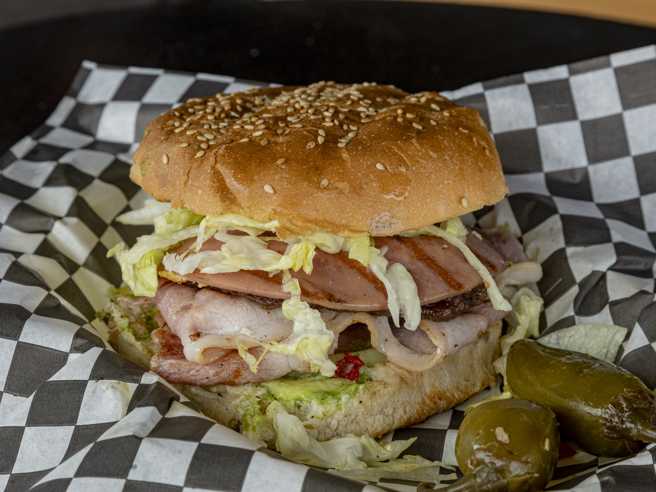 Carne 100% de res (130g), queso chihuahua, jamón, queso amarillo, lechuga, tomate, cebolla, aderezos.