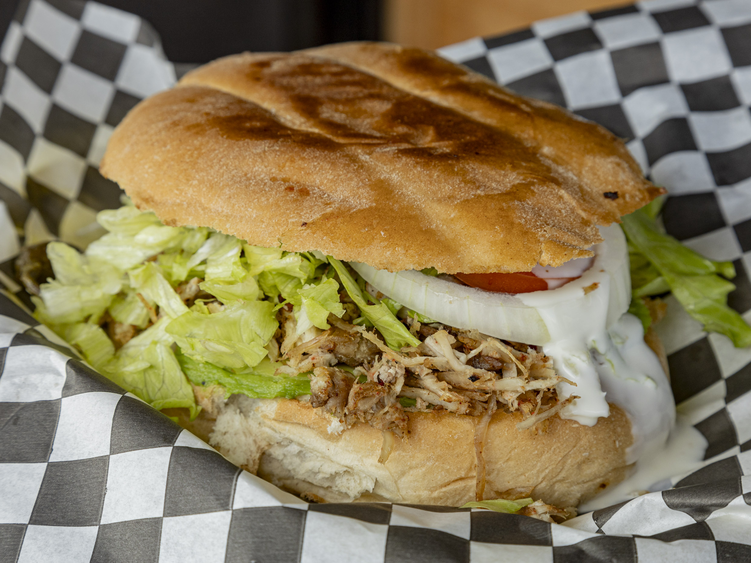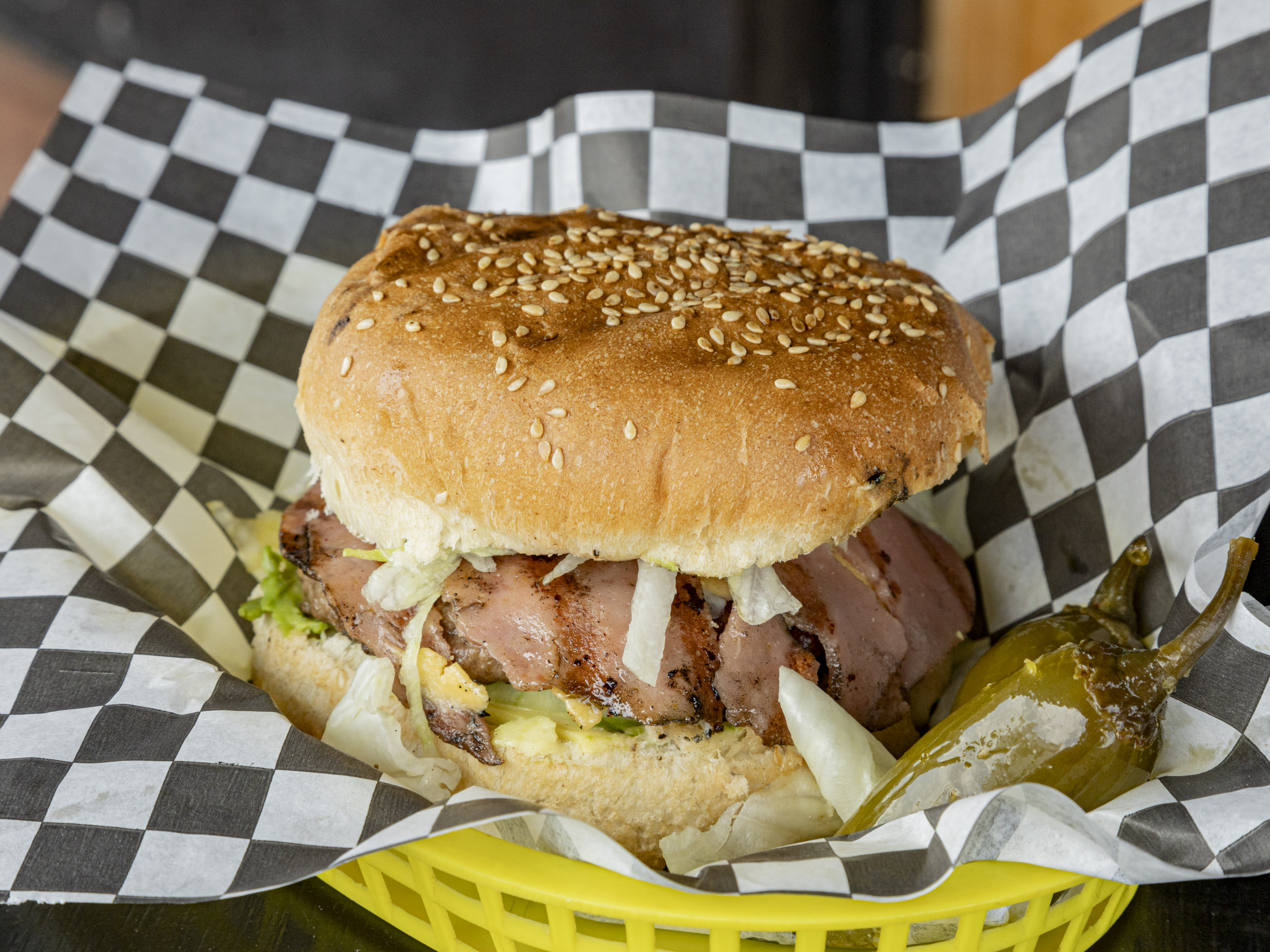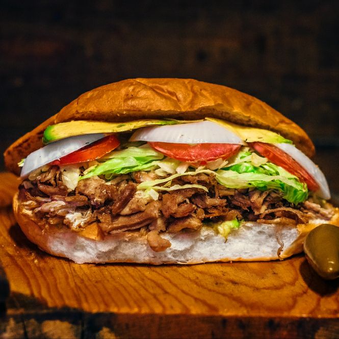 Torta cubana con pan telera, pierna, jamón, queso blanco, queso amarillo, aguacate, chile, tomate, cebolla, lechuga y crema. Una pieza