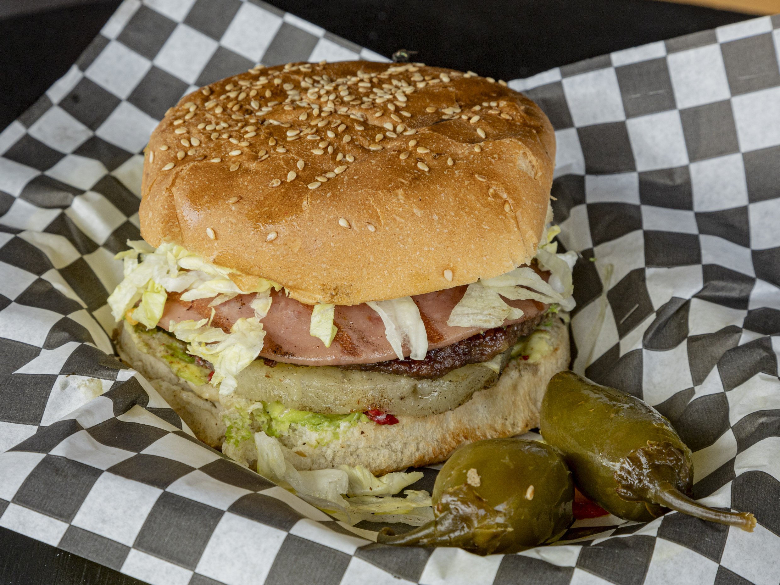 Carne 100% de res, queso chihuahua, jamón, queso amarillo, lechuga, tomate, cebolla, aderezos.