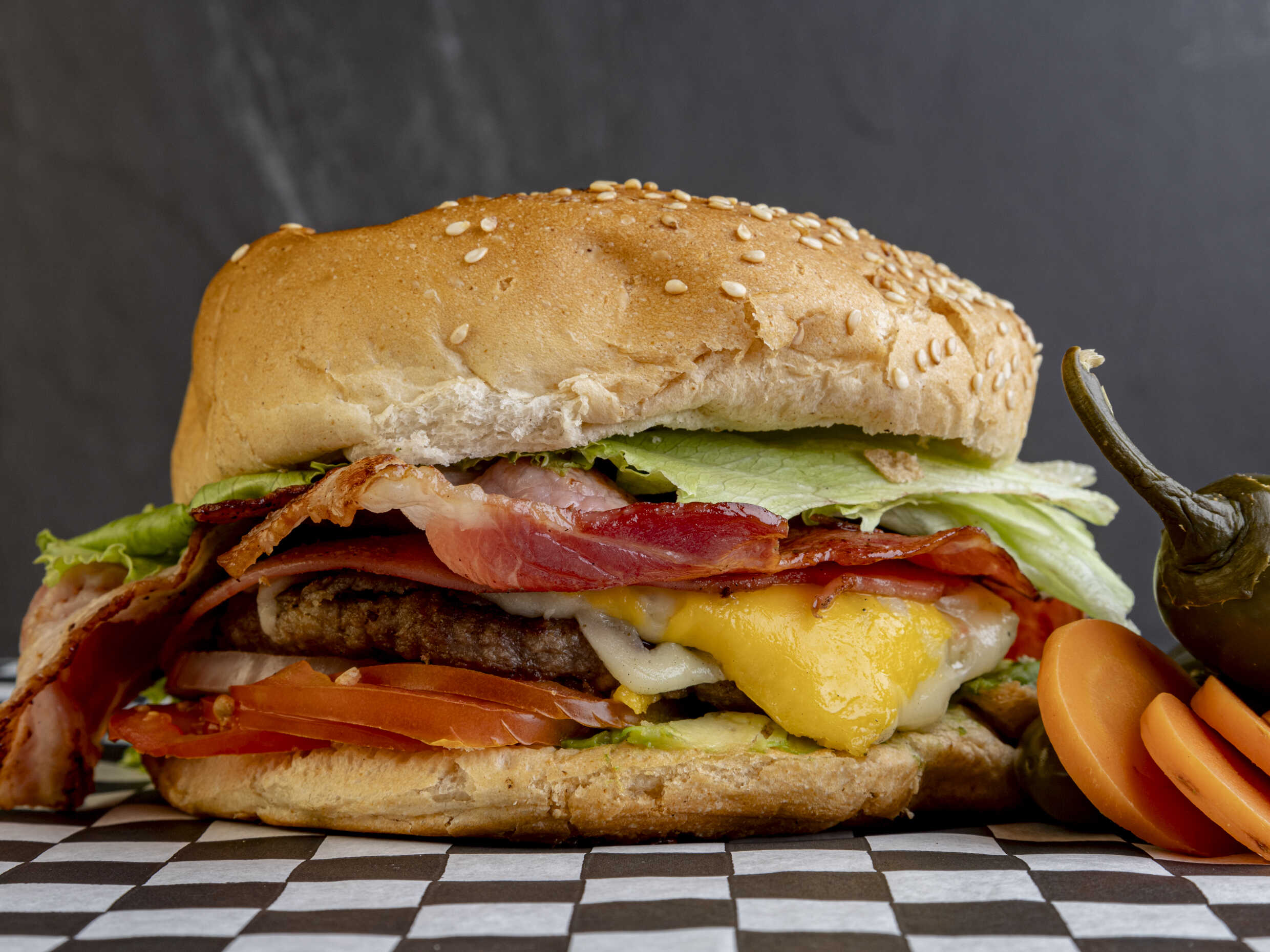 Doble Carne 100% de res, queso chihuahua, jamón, queso amarillo, lechuga, tomate, cebolla, aderezos.