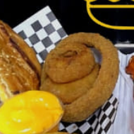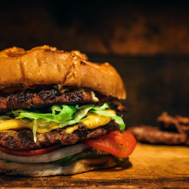 Carne 100% de res, queso chihuahua, jamón, queso amarillo, lechuga, tomate, cebolla, aderezos y aros de cebolla