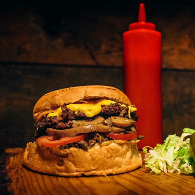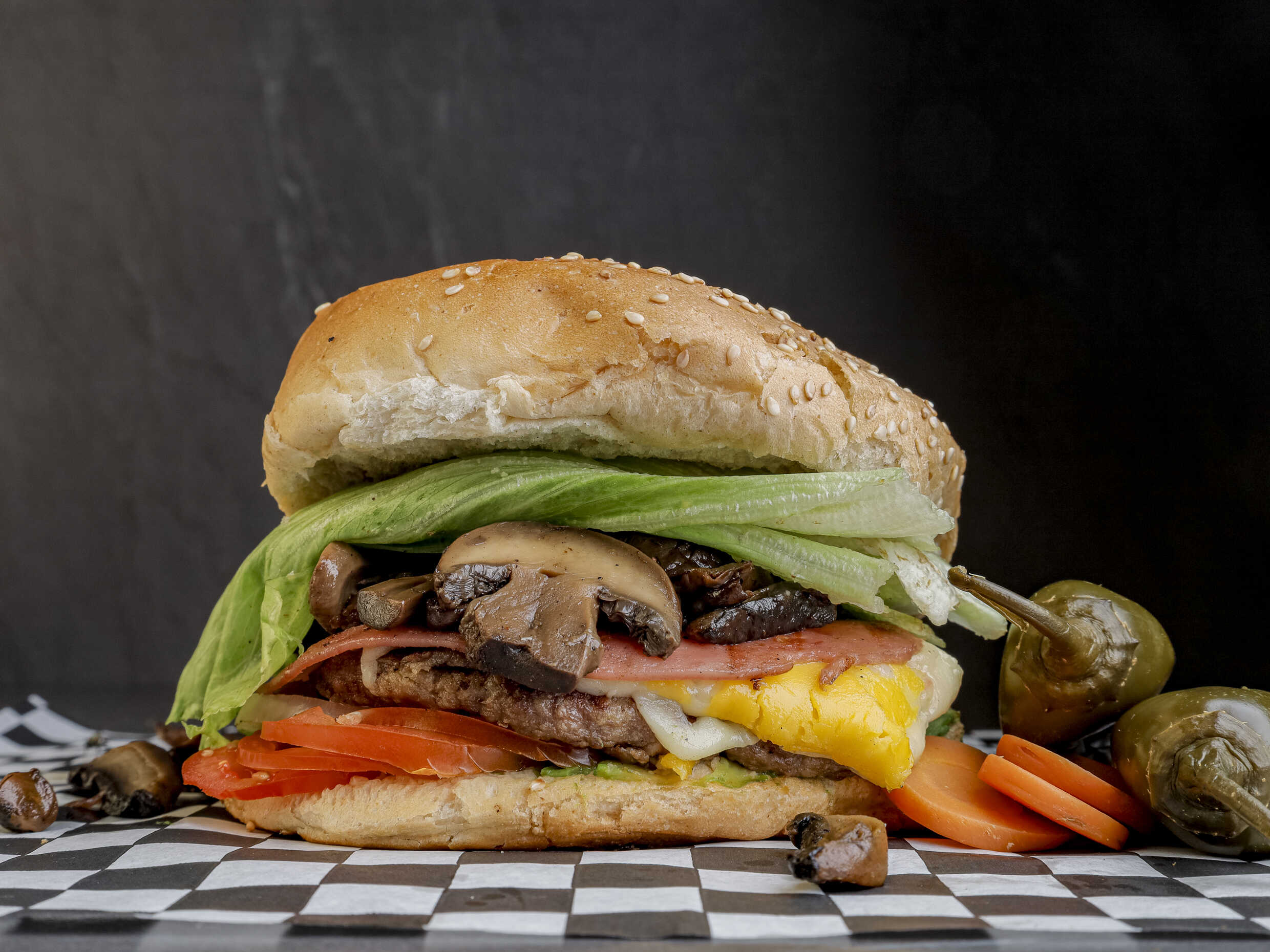 Carne 100% de res, queso chihuahua, jamón, queso amarillo, lechuga, tomate, cebolla, aderezos.y champiñones