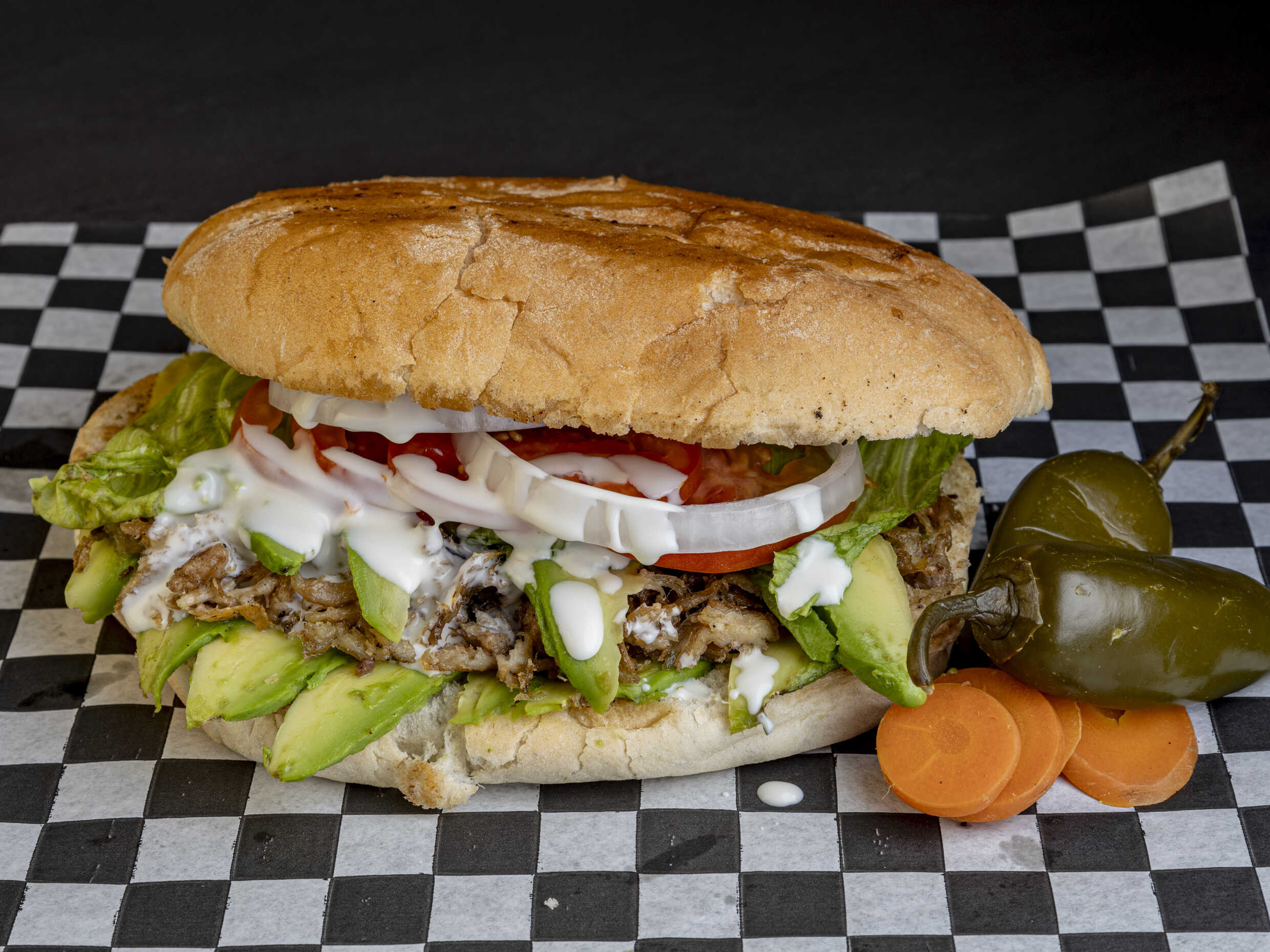 Telera(pan) con pierna de puerco de 130gr,contiene verdura,lechuga,tomate,cebolla,aguacate en trozos,1 tajada de queso amarillo y queso chihuahua rallado.