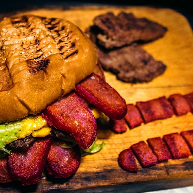 Carne 100% de res con 180 gr,contiene queso chihuahua rallado,1 tajada de jamón y queso amarillo,lechuga,tomate y cebolla. Con salsas de tomate,mayonesa,mostaza y una capa de aguacate huntado en el pan.