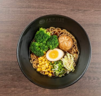 Caldo a base de miso con chiles y especies, alga, wakame, con rebanadas de lomo de cerdo marinado, huevo, col, elote y cebollín.