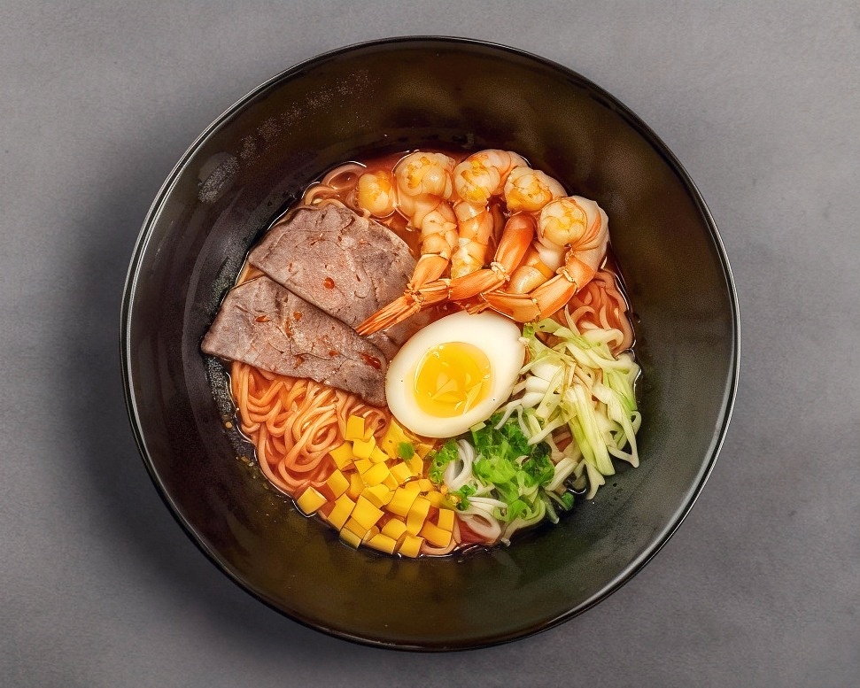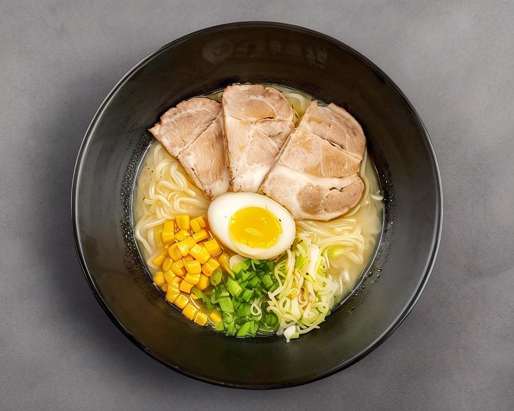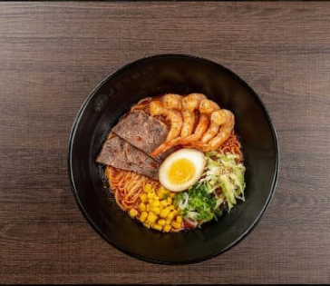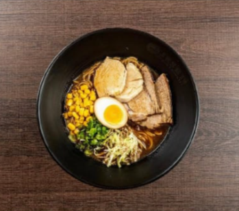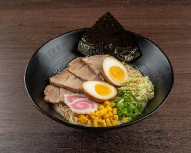 Caldo condimentado a base de chiles y especies con rebanadas de lomo de cerdo marinado, narutomaki doble, huevo, col, elote y cebollín.