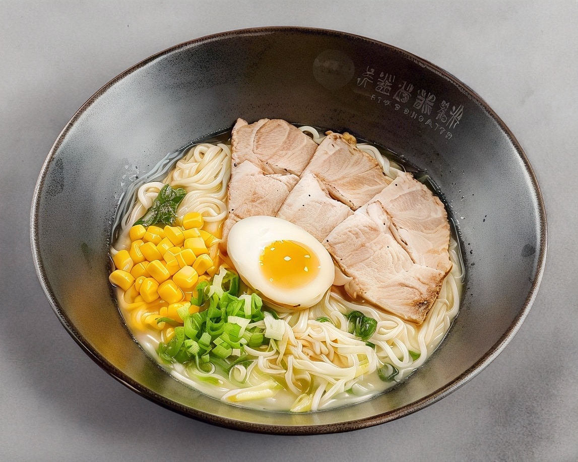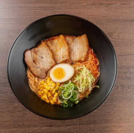 Caldo a base de miso con chiles y especies, alga, wakame, con rebanadas de lomo de cerdo marinado, huevo, col, elote y cebollín.