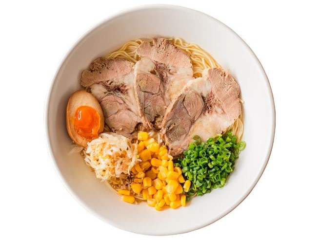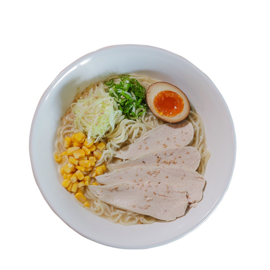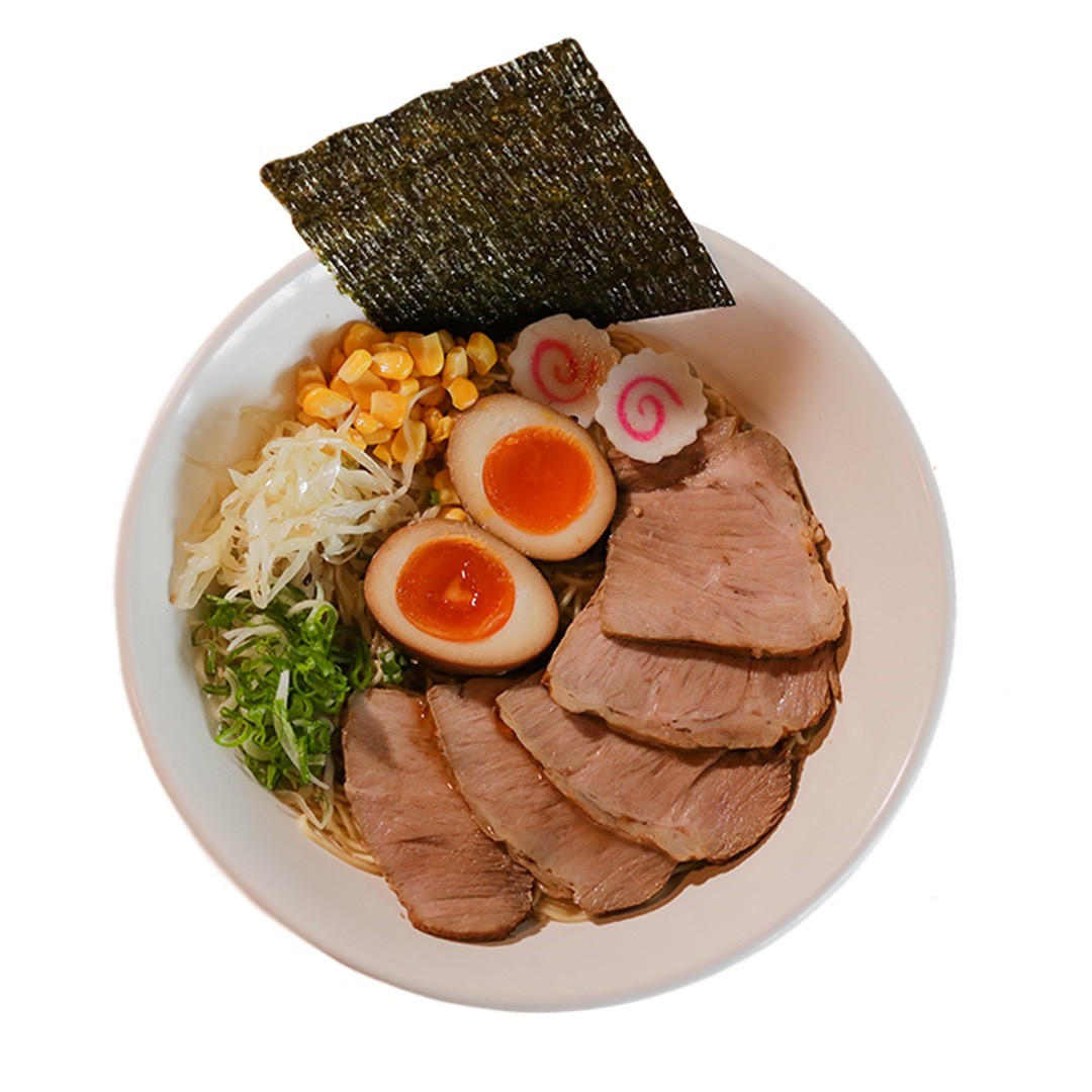 Ramen con suculentas rebanadas de lomo de puerco, naruto maki, alga nori y doble huevo.