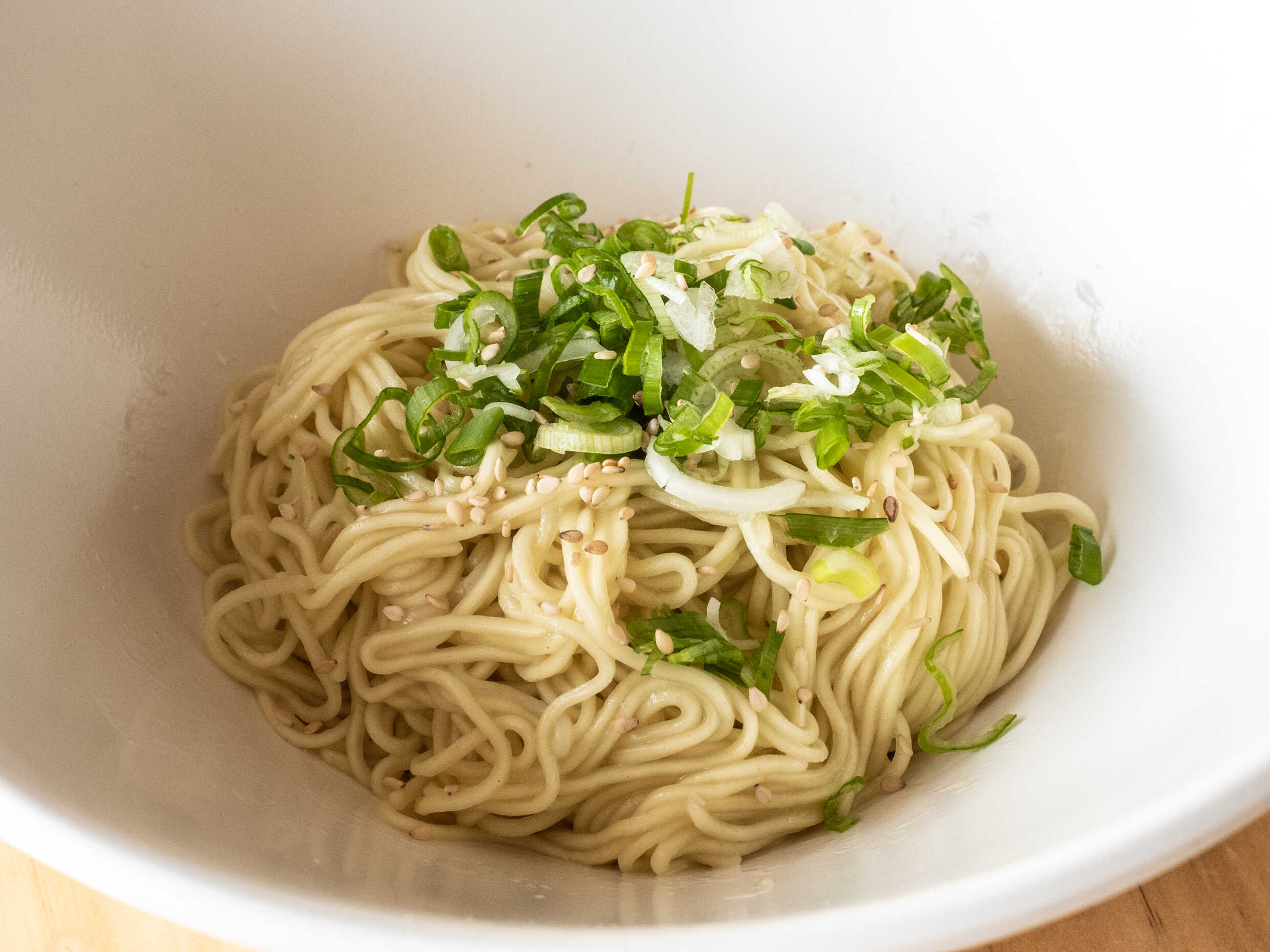 Ramen con rebanadas de tocineta sellada a la plancha.