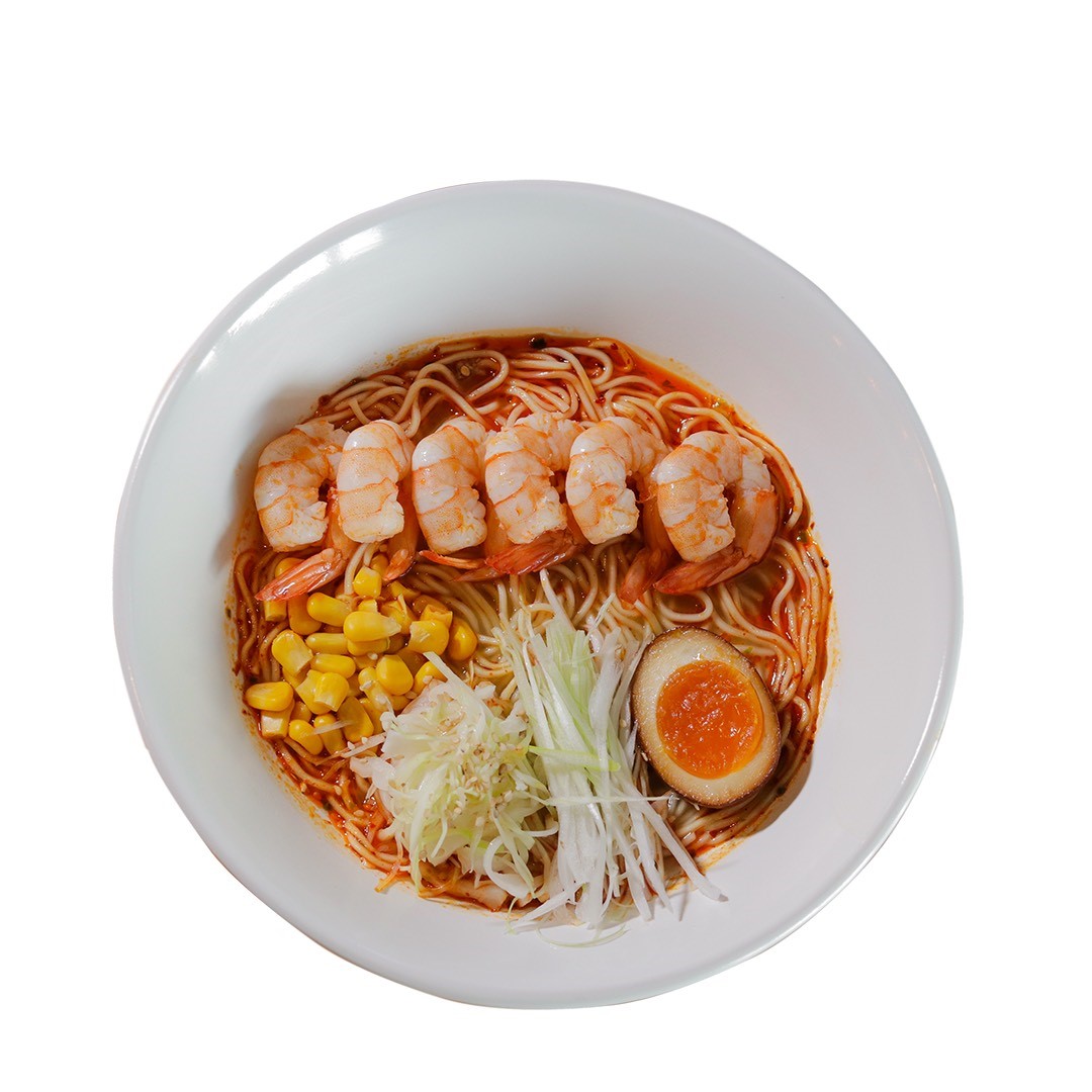 Ramen con caldo condimentado a base de chiles y especias con ricos camarónes.