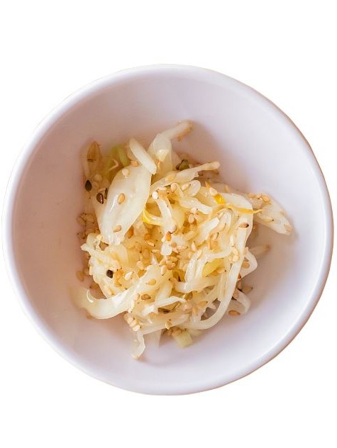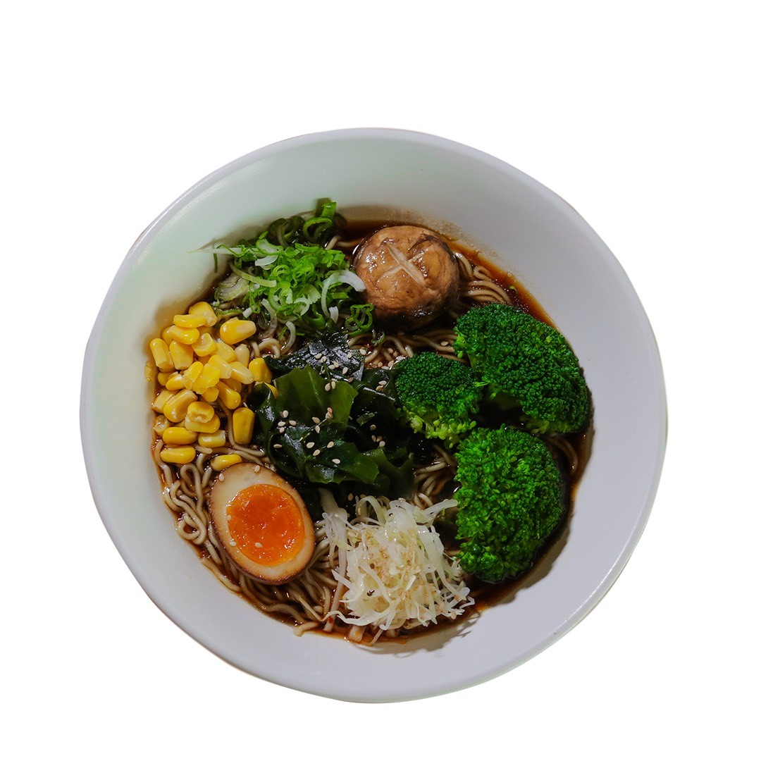 Ramen con caldo a base de soja preparada y alga marina, con brocoli tierno y champiñones.
