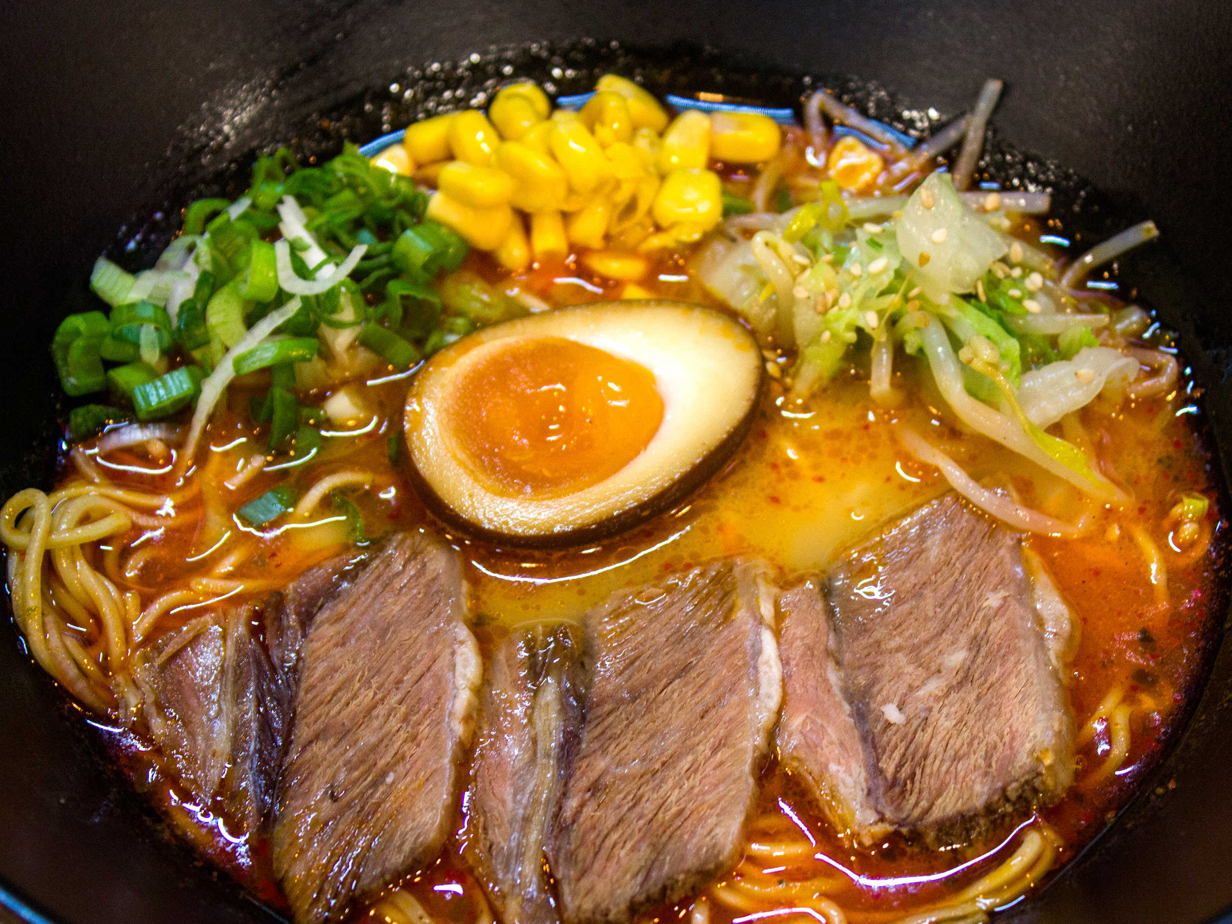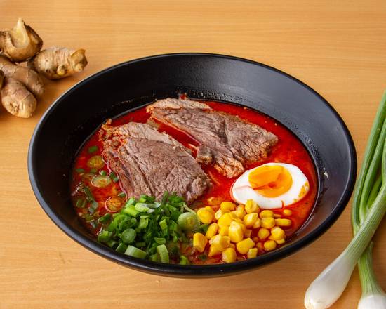 Caldo condimentado a a base de chiles y especias. Acompañado con lomo de cerdo marinado, elote, cebolla cambray, huevo cocido y lechuga napa.