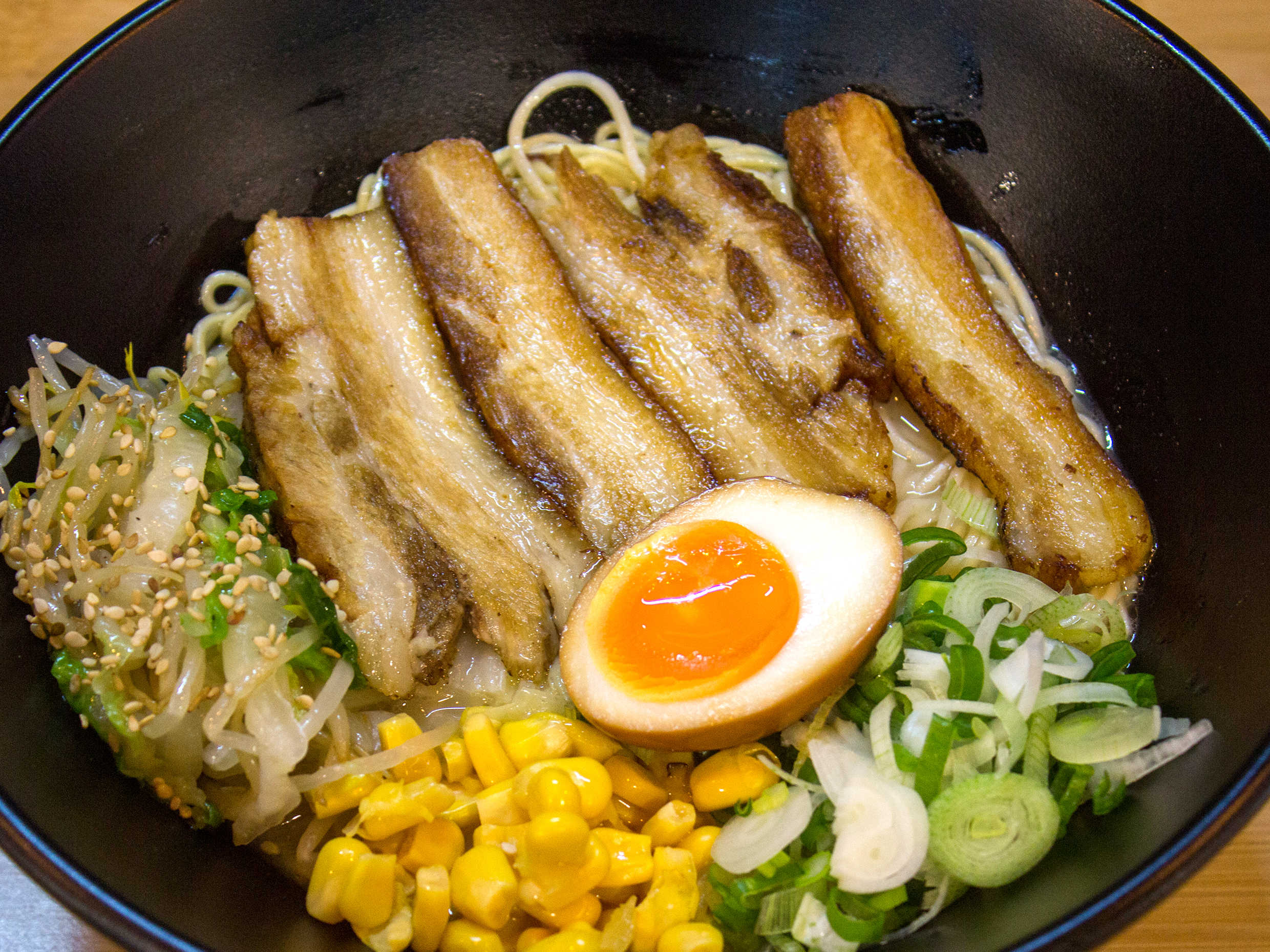 Con rebanadas de tocineta de puerco sellada a la plancha acompañado de huevo pre cocido, elote, cebolla cambray y lechuga napa.