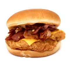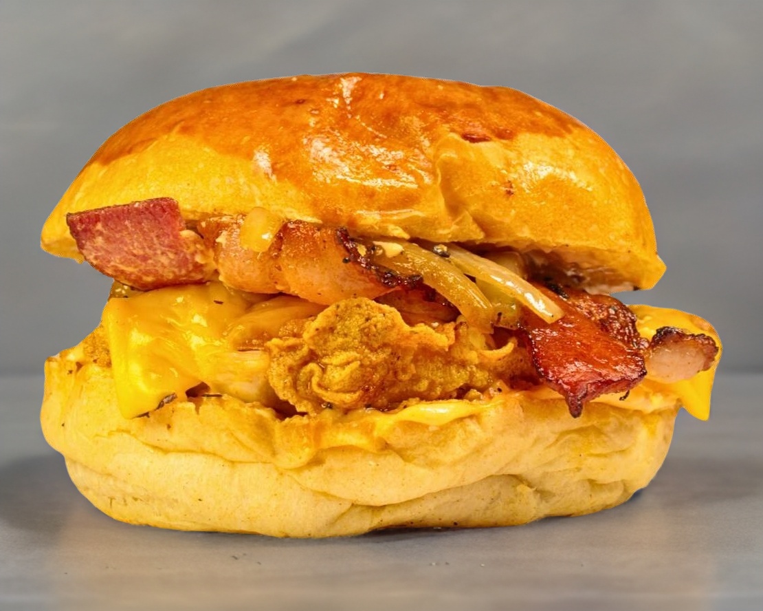 Pechuga de pollo empanizado, queso amarillo americano, tocino, cebolla caramelizada y aderezo ketchipotle, incluye porción de papas a la francesa.