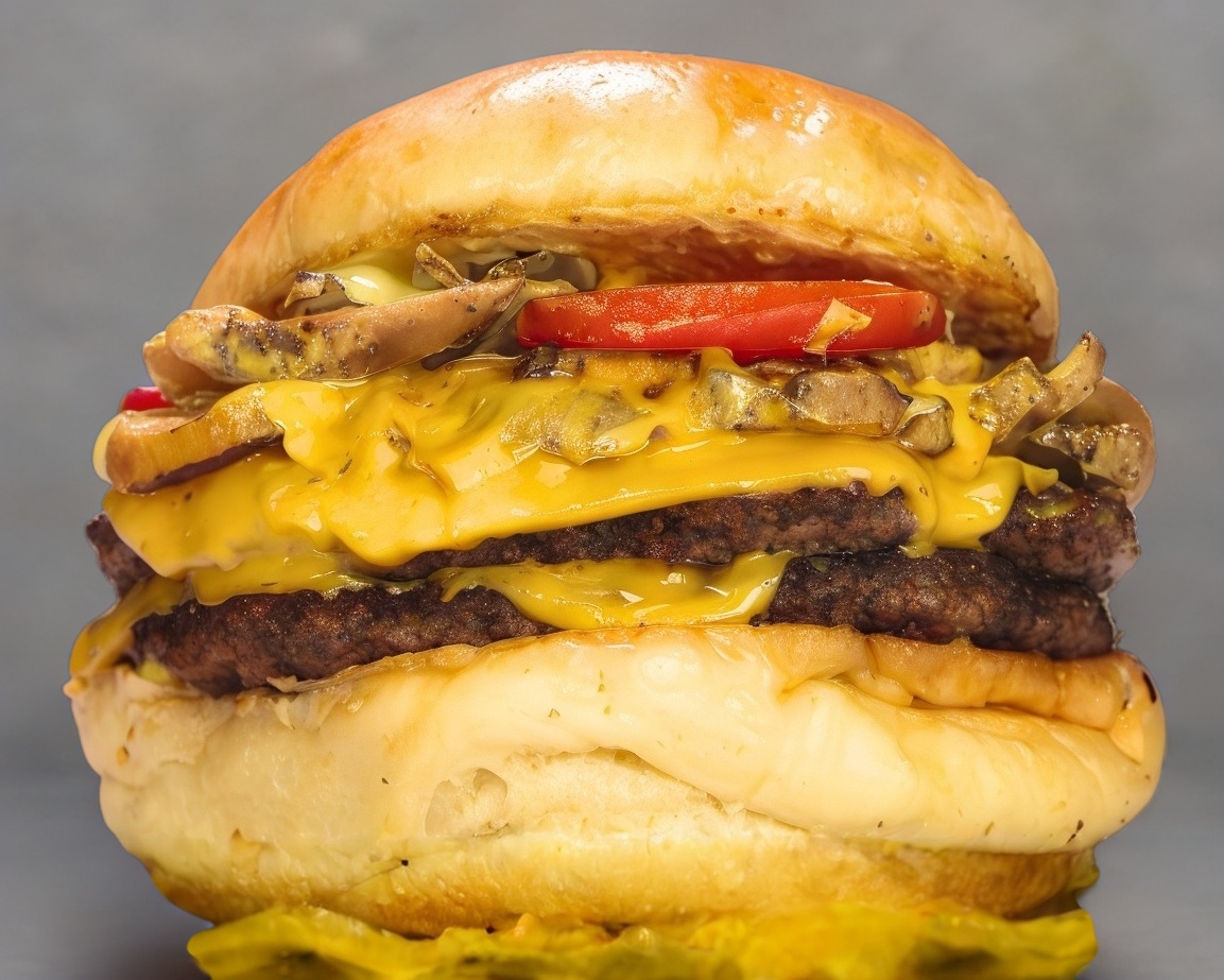 UNA EXPLOSIÓN DE SABORES CON CARNE DE RES, QUESO AMARILLO AMERICANO, LOS DOS ADEREZOS DE LA CASA, TOCINO, MEZCLA DE CHAMPIÑONES, PiMIENTO ROJO Y QUESO DERRETIDO, INCLUYE PORCION DE PAPAS A LA FRANCESA.