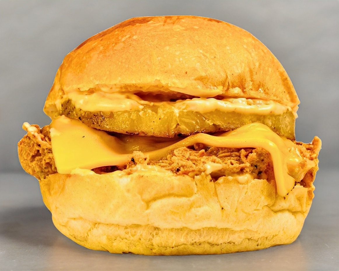 PECHUGA DE POLLO EMPANIZADA, QUESO AMARILLO AMERICANO, PIÑA EN ALMIBAR Y ADEREZO KECHIPOTLE, INCLUYE PORCION DE PAPAS A LA FRANCESA.