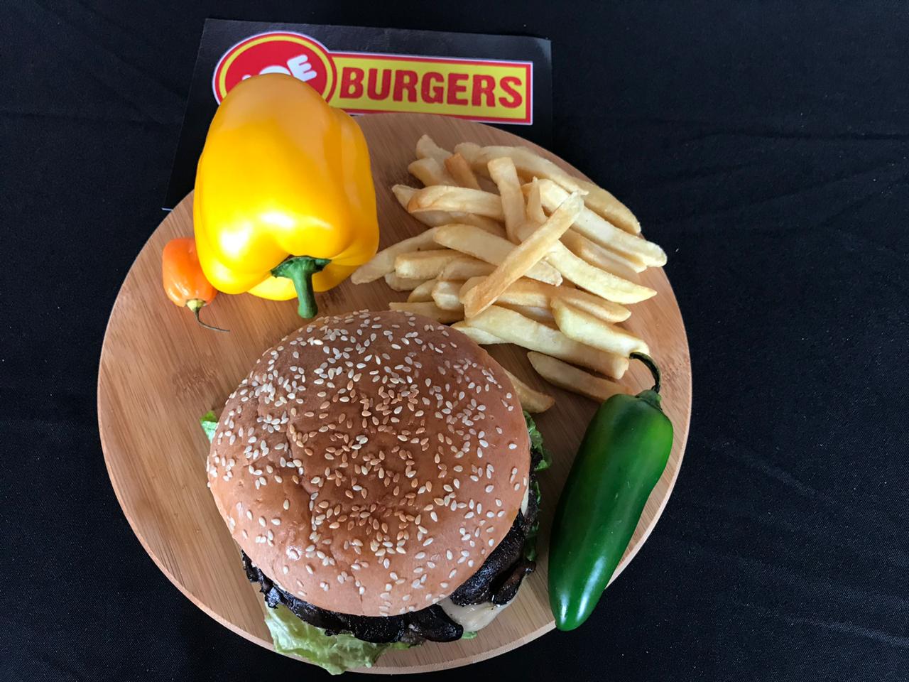 Black angus beef, queso chihuahua menonita, deliciosos champiñones con gravy, mayonesa, mostaza, tomate, cebolla, lechuga, papas y refrescos. 180 gramos.