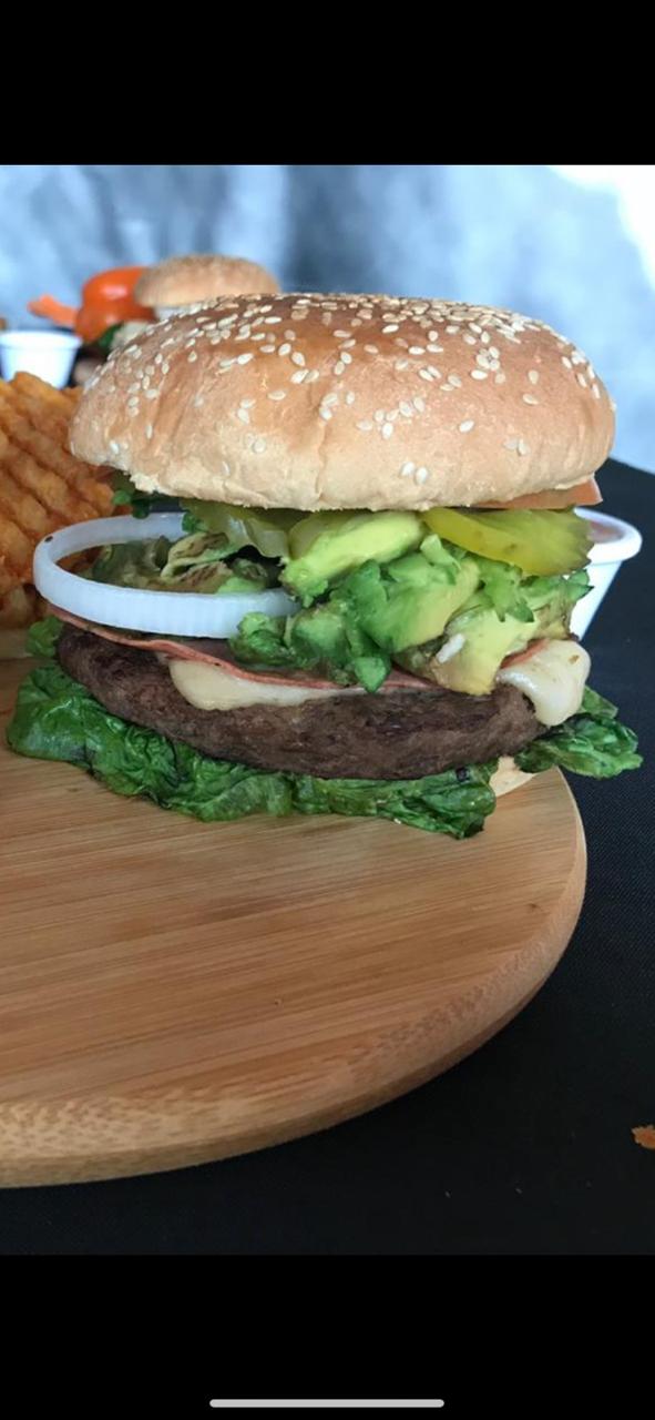 Black angus beef, queso chihuahua menonita, deliciosas rodajas de aguacate, jamón, mayonesa, mostaza, tomate, cebolla y lechuga. 180 gramos.