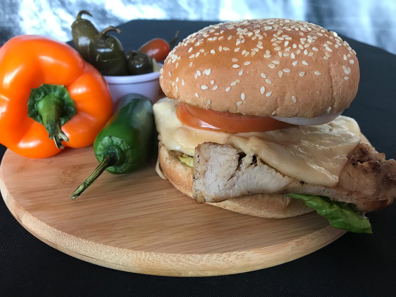 Pechuga de pollo natural a la parrilla, queso chihuahua menonita, mayonesa, mostaza, tomate, cebolla y lechuga. 200 gramos.