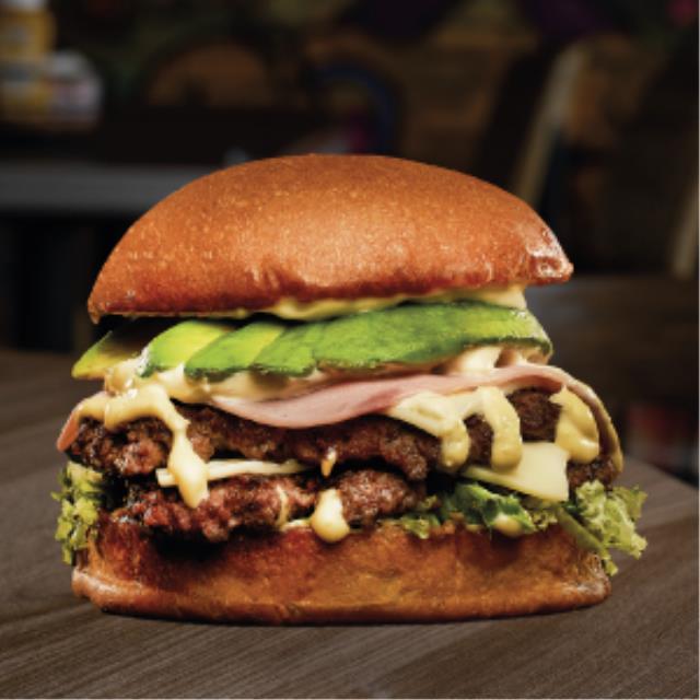 Hamburguesa de carne (200 gr.), jamón, aguacate, lechuga, aderezo serrano, queso americano y suizo.
