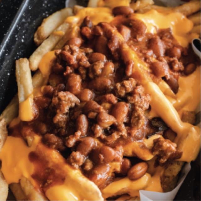 300g de papas fritas con chili casero y queso amarillo derretido.