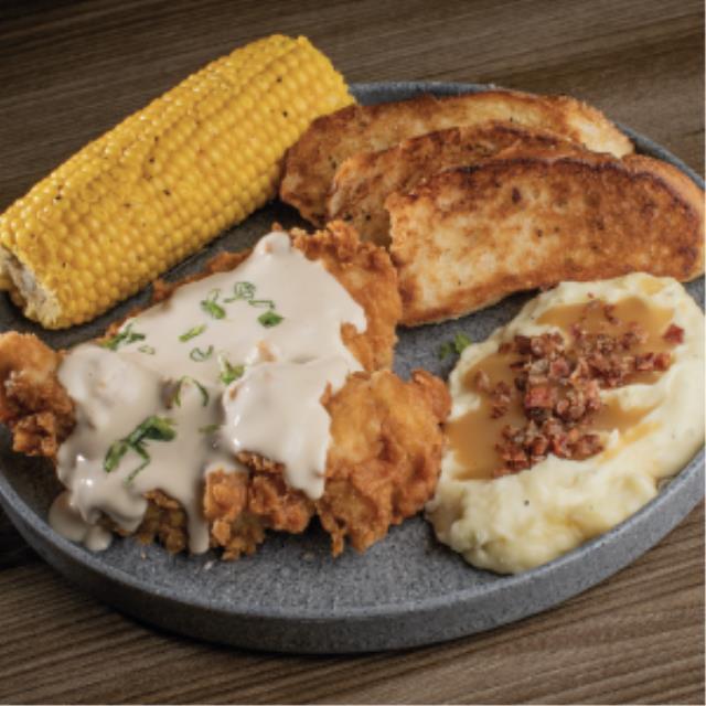 Pechuga de pollo, bañada en salsa alfredo. Acompañado de elote amarillo, puré de papa con gravy de pavo, tocino y pan parmesano y mantequilla.