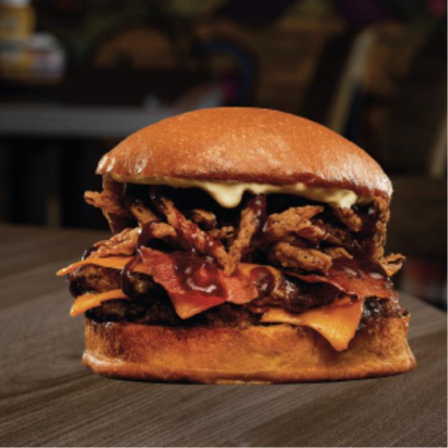 Hamburguesa de carne (200 gr.), tiras de tocino, cebolla empanizada bañanda en bbq, queso americano y suizo.