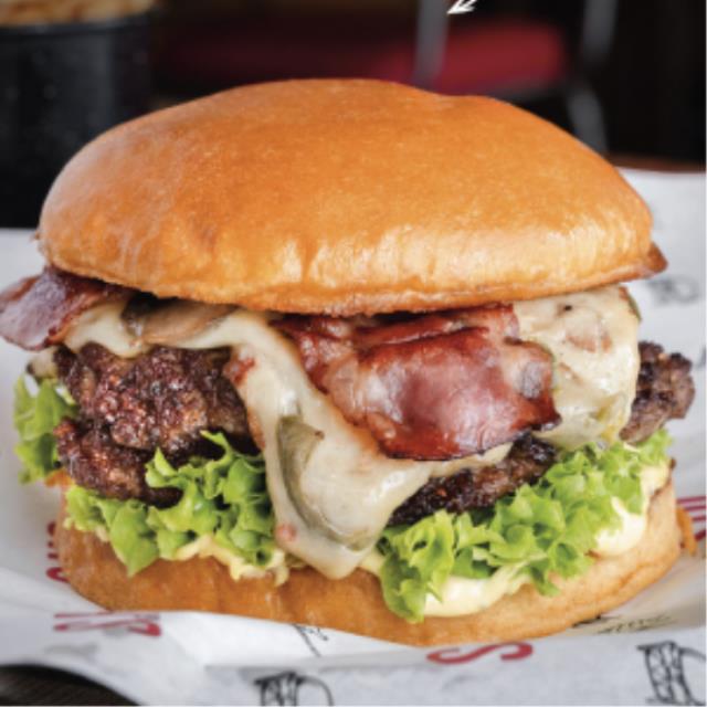 Hamburguesa de carne (160 gr.), mezcla de quesos y champiñones salteados, pimiento verde, lechuga y tocino.