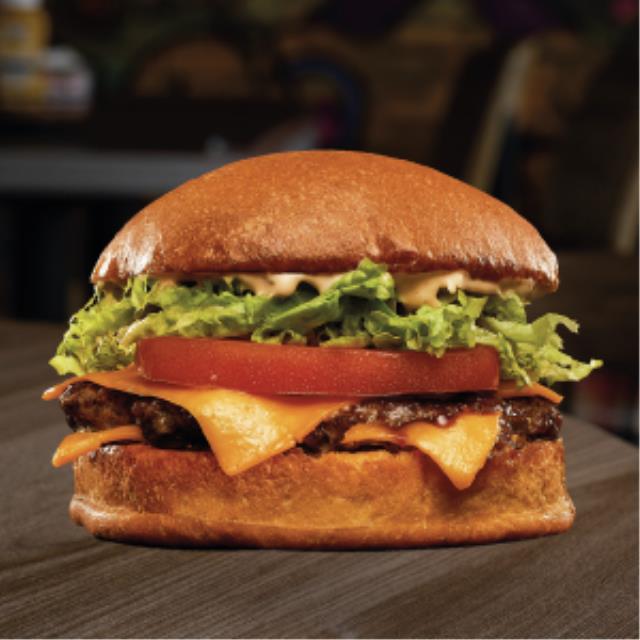 Hamburguesa de carne (160 gr.), aderezo jack, lechuga italiana, cebolla, tomate, queso americano y suizo.