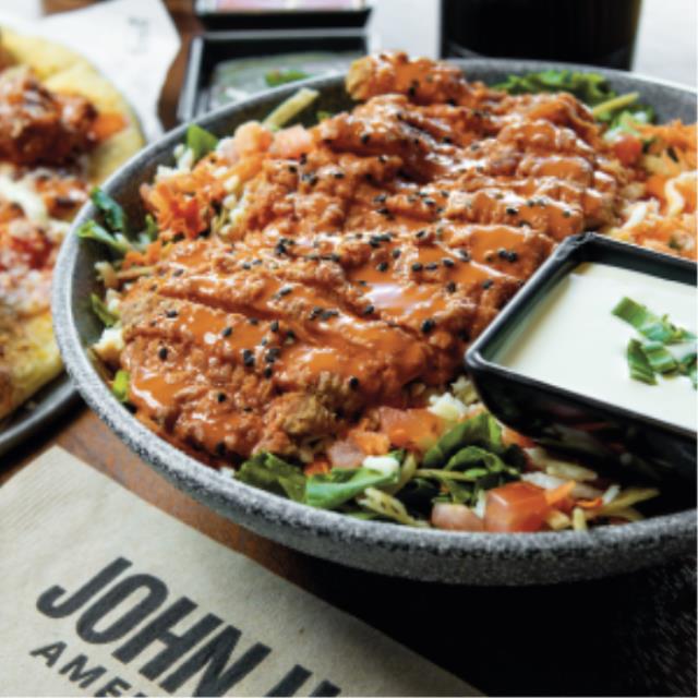 Lechuga italiana, pechuga de pollo con salsa buffalo, tomate, aguacate, queso mozzarella, tiras de tortilla, zanahoria, ajonjolí negro y blue cheese.