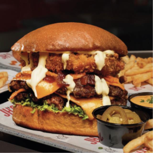 Burger de carne, mermelada de tocino con whiskey, aro de cebolla empanizado con tempura de cerveza, aderezo serrano, ruffles queso americano y suizo.