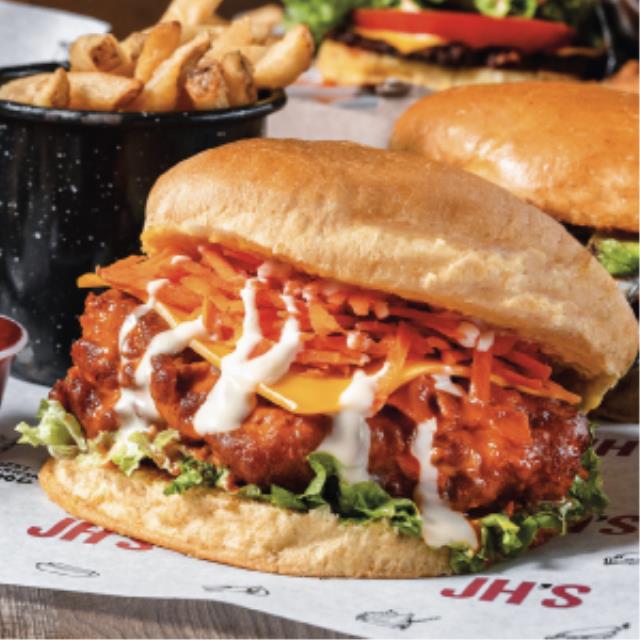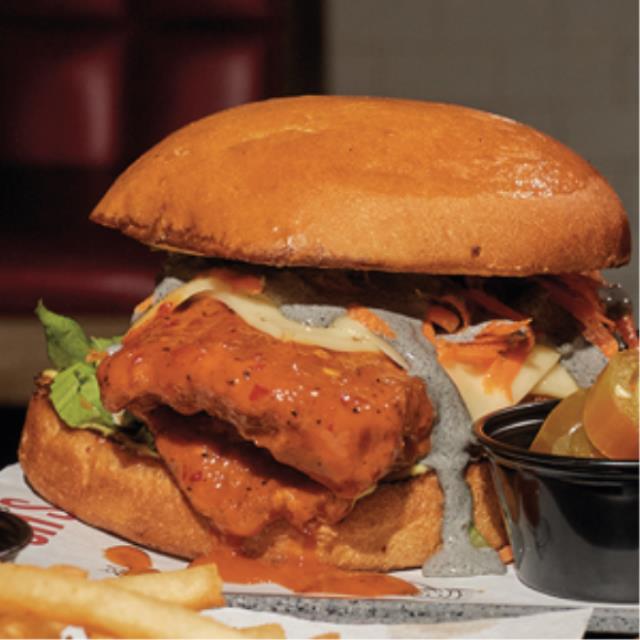 Hamburguesa con pechuga de pollo empanizada (160 gr.), lechuga, zanahoria, salsa buffalo, blue cheese, queso americano y suizo.