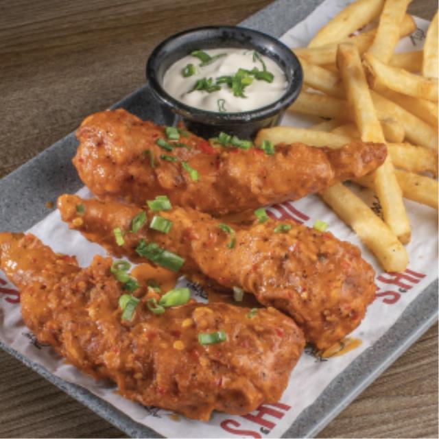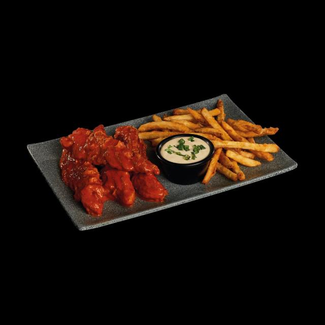 Tiras de pollo empanizadas y bañadas en salsa Spicy con un toque de cebollín, acompañadas de papas fritas y aderezo al gusto (Ranch o Blue Cheese).