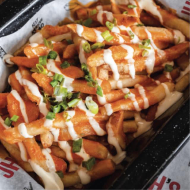 300g de papas fritas con salsa buffalo y aderezo ranch con cebollin.